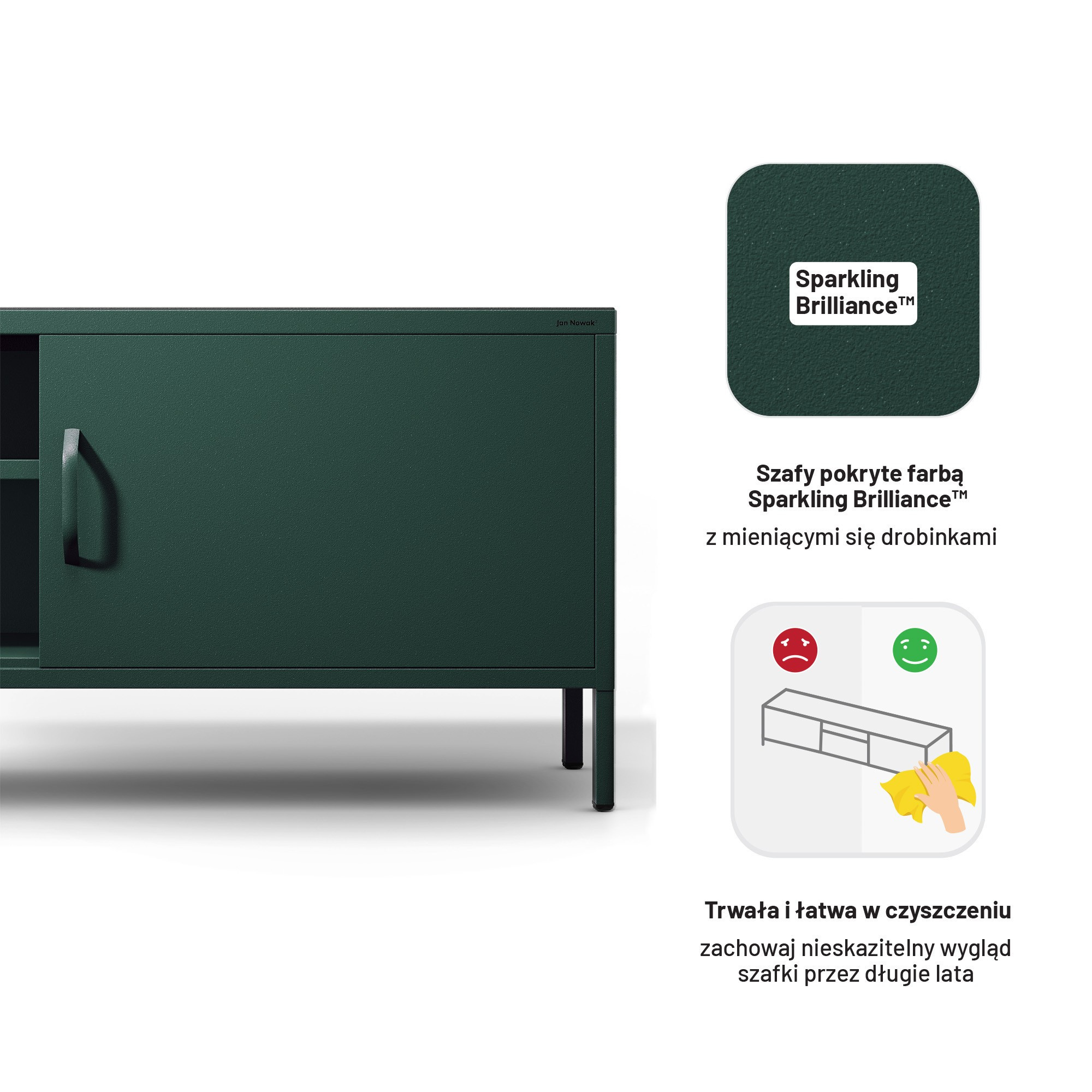 Na první pohled vás zaujme unikátní barva Sparkling Brilliance™, která skříňku ROSARIA odlišuje od běžného nábytku. Lahvově zelená s jemnými třpytivými částečkami vytváří luxusní a sofistikovaný vzhled. Tento decentní třpyt dodá vašemu interiéru nádech elegance a originality, aniž by působil rušivě.