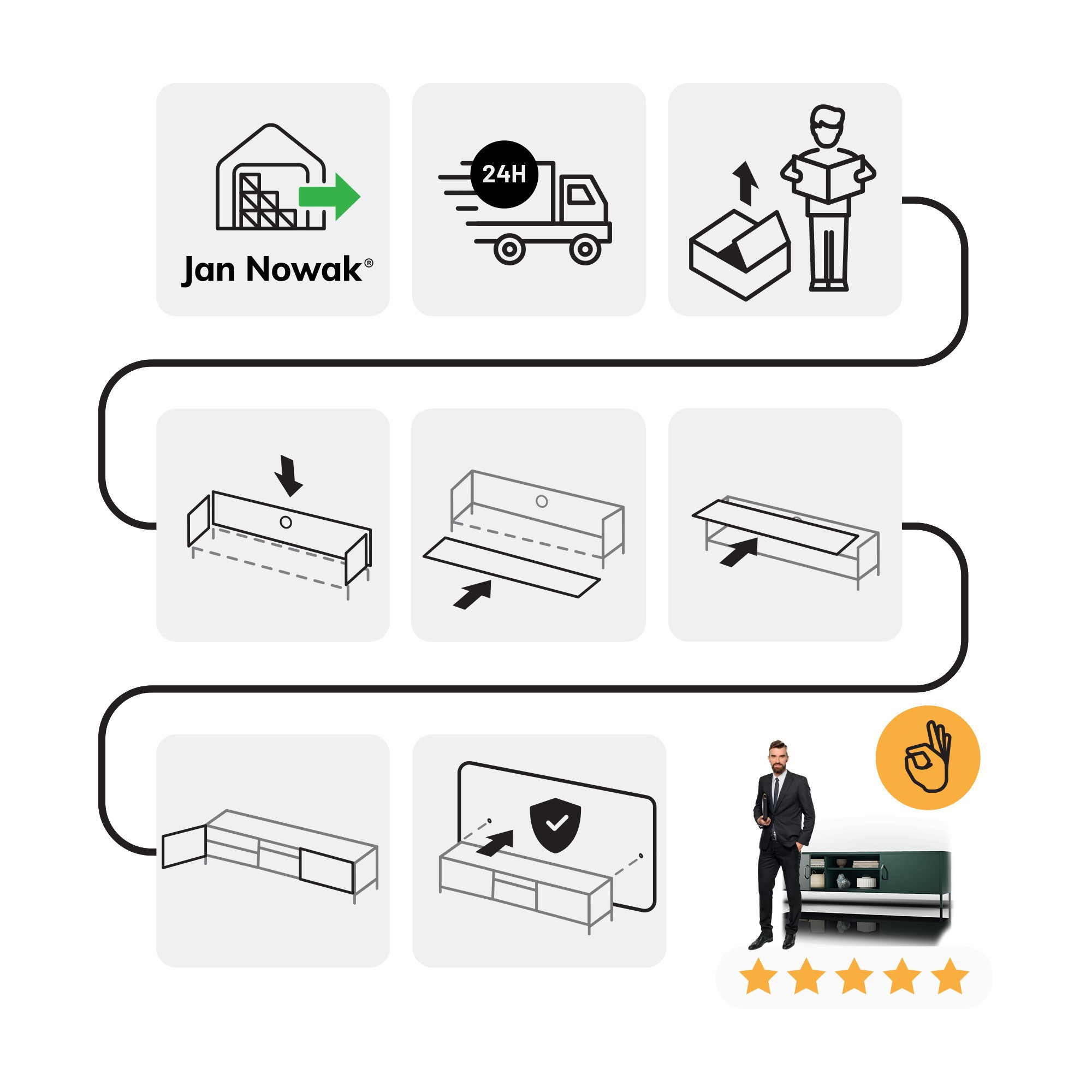 - Dvě odolné police s nosností do 40 kg: Umožňují bezpečné uložení elektroniky a dekorací.