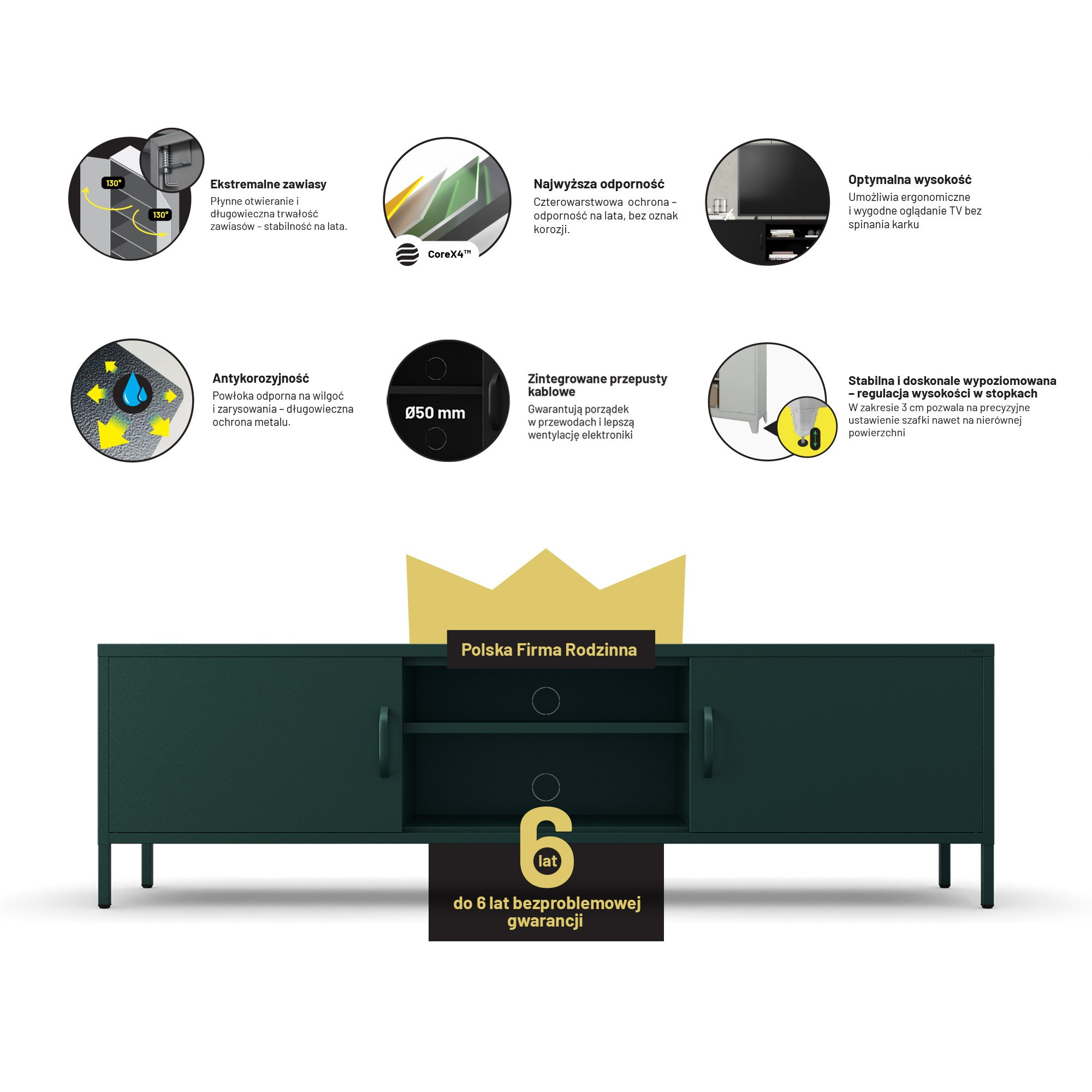 Jednoduchý a symetrický tvar skříňky XL ROSARIA se snadno začlení do jakéhokoli interiéru. Její moderní design jde ruku v ruce s vysokou kvalitou zpracování. Skříňka je vyrobena z odolné oceli o tloušťce 0,6 mm, která zaručuje dlouhou životnost a stabilitu. Prášková barva chrání povrch před poškrábáním a promáčknutím, takže si můžete být jisti, že vaše skříňka bude vypadat skvěle i po letech používání.