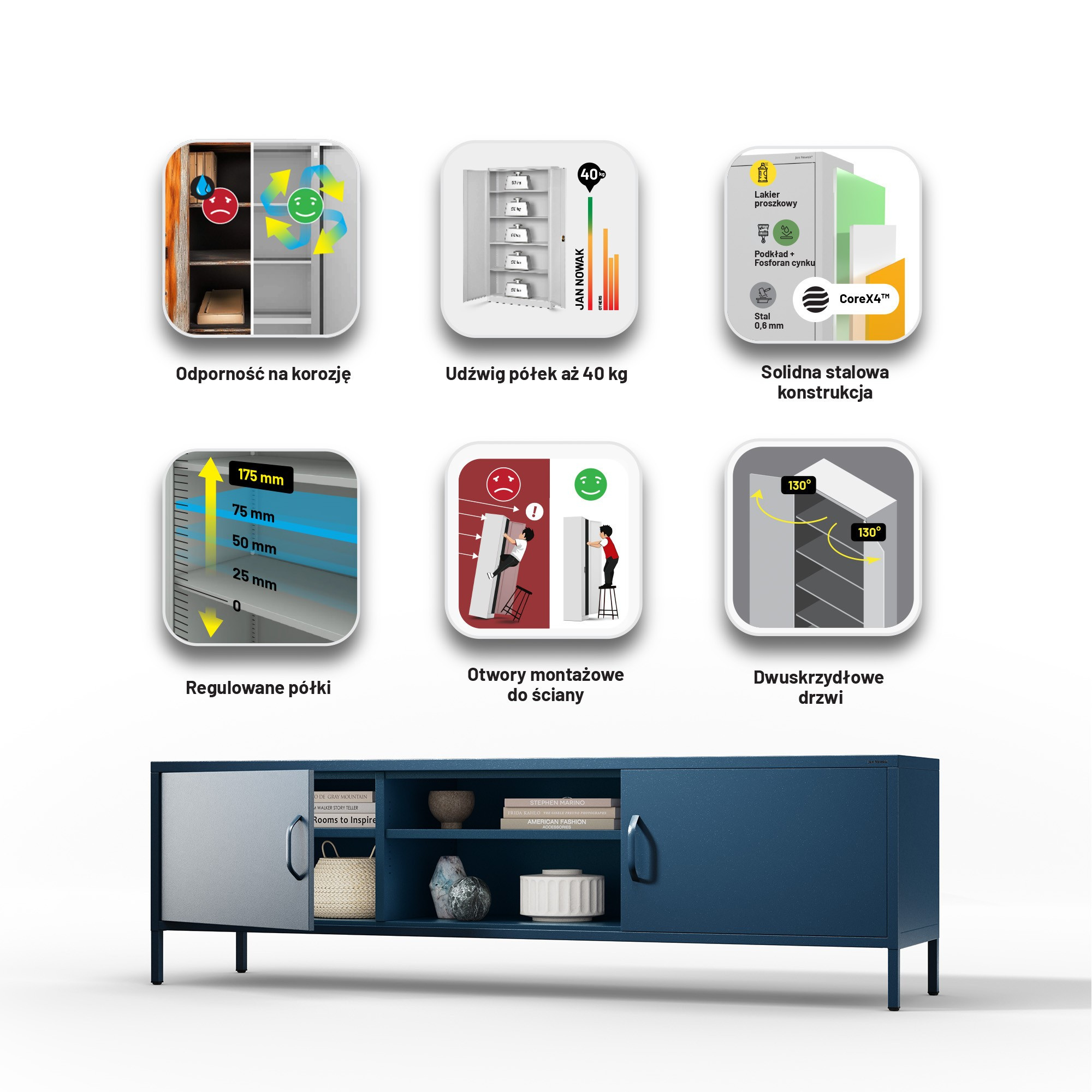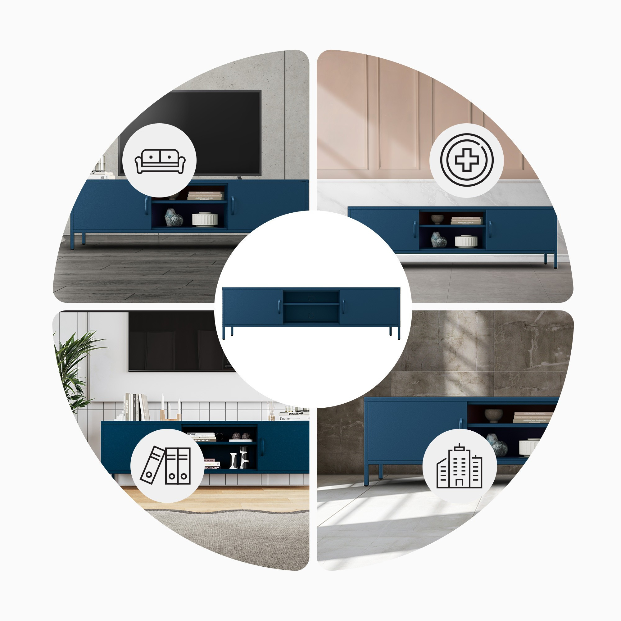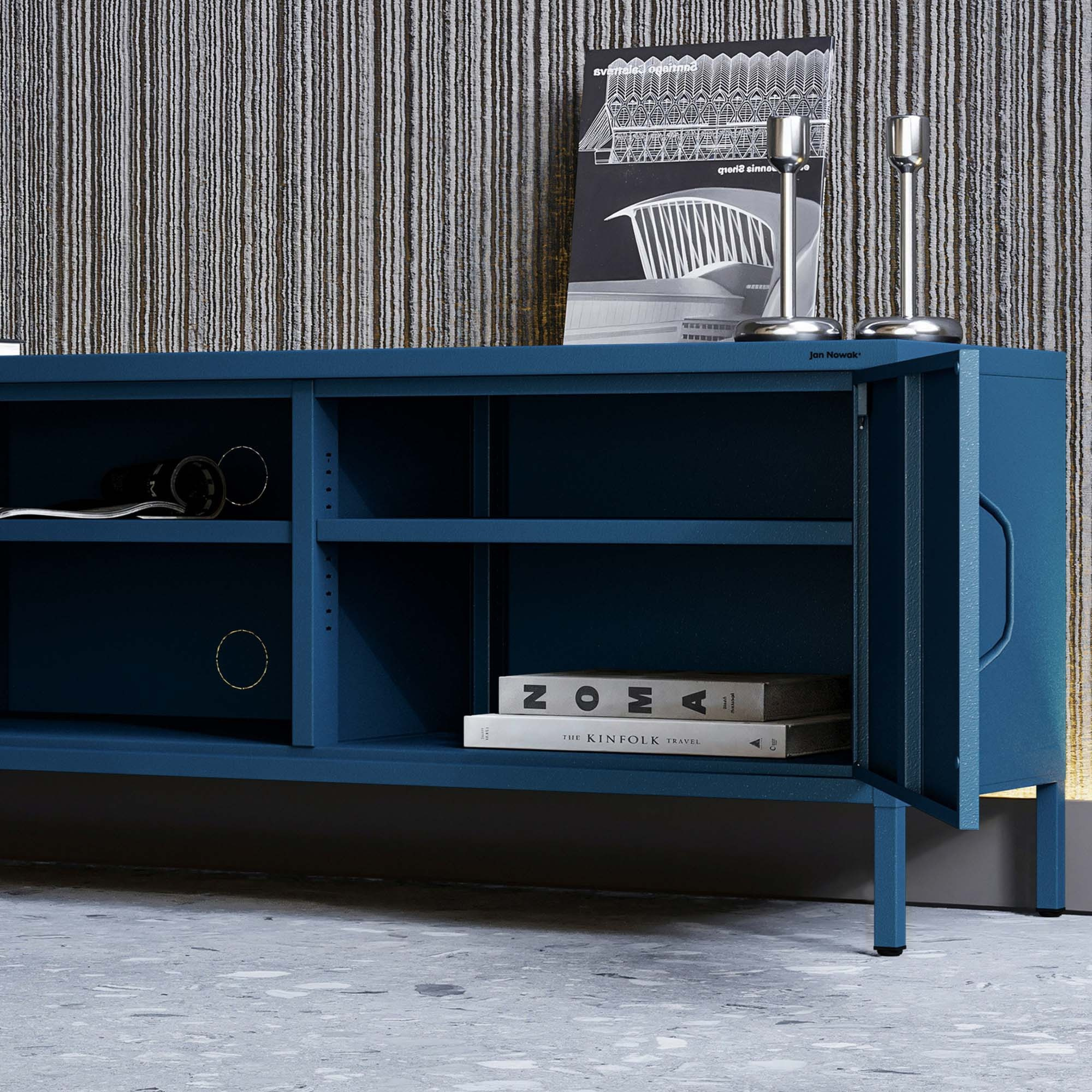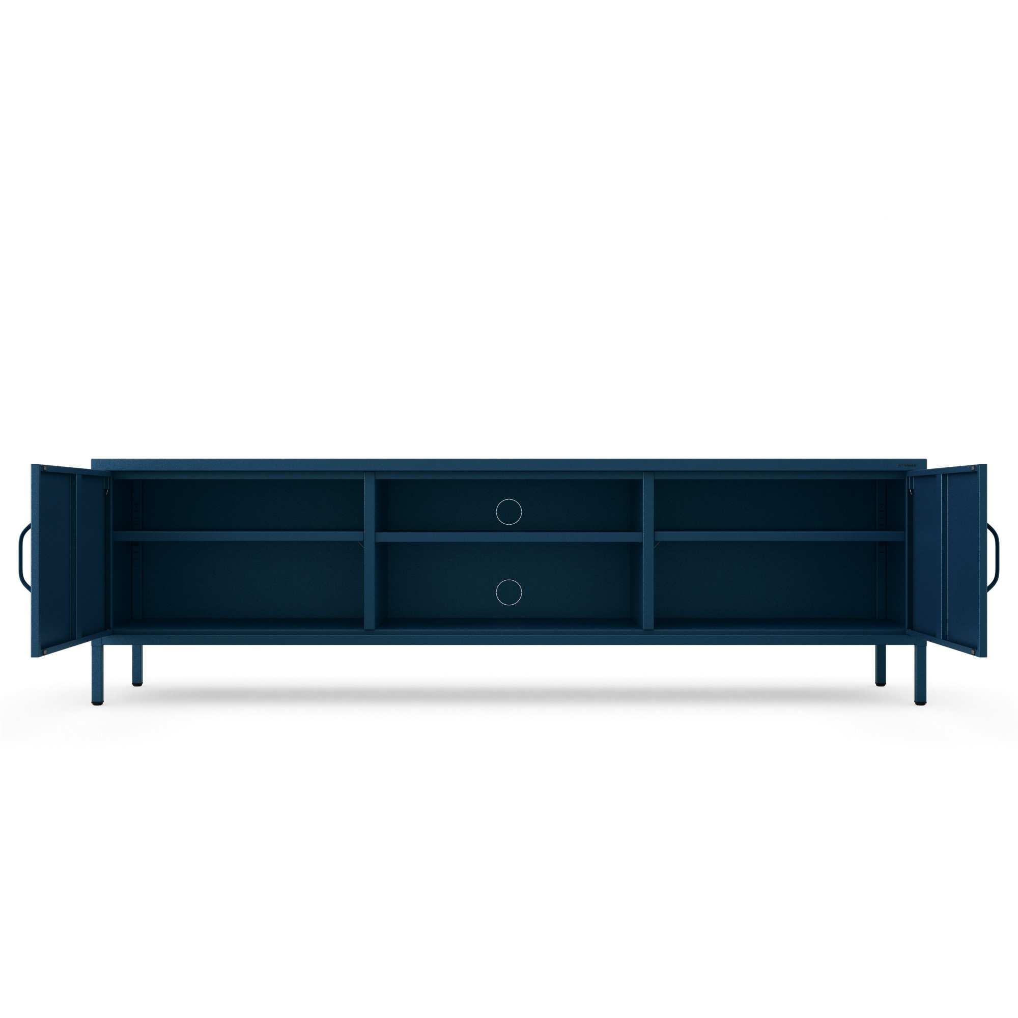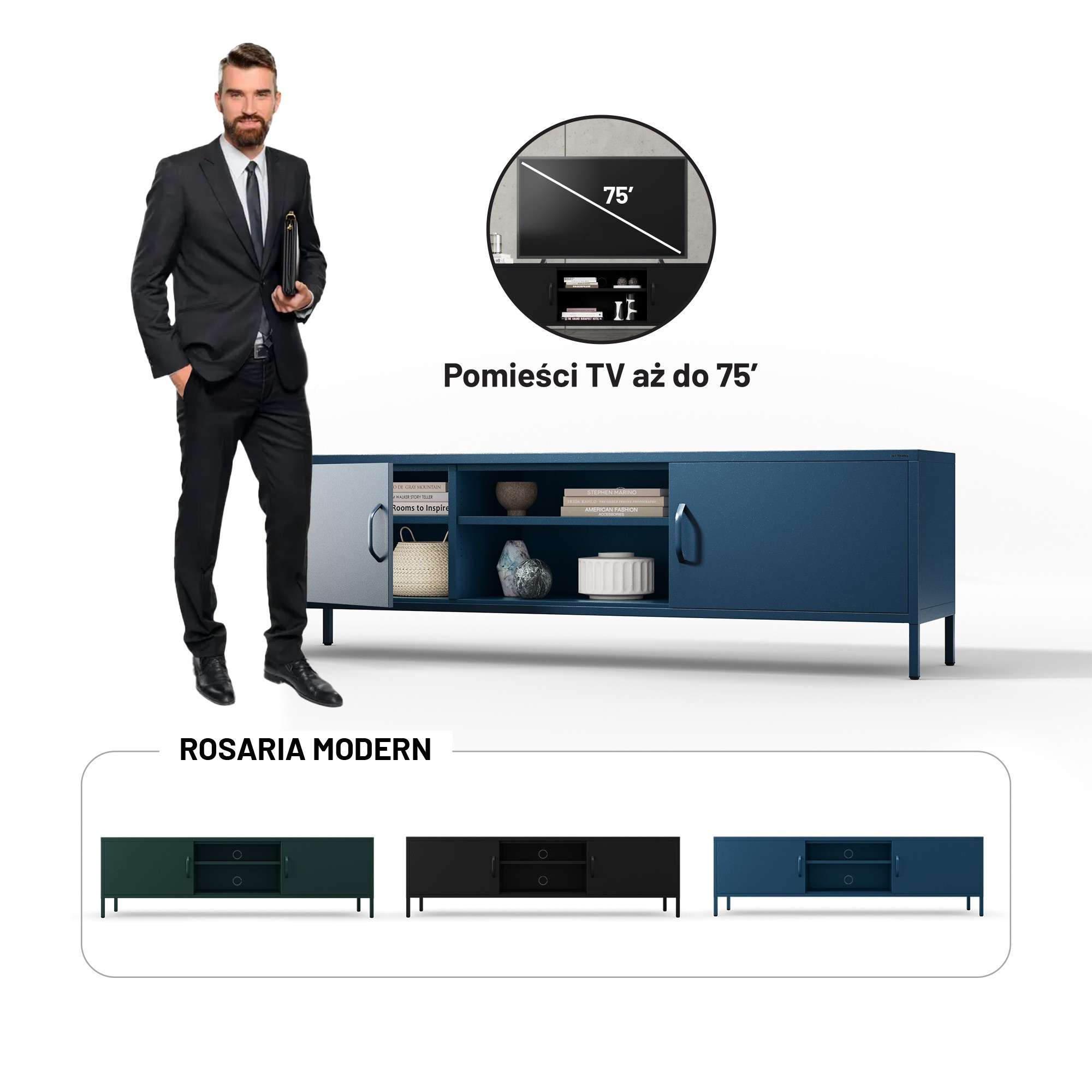 Minimalistický design TV skříňky ROSARIA se snadno hodí do různých stylů interiérů. Hluboký odstín námořnické modré přitahuje pozornost a dodává prostoru eleganci a harmonii. Kromě výjimečného vzhledu se můžete spolehnout i na solidní provedení. Ocelová konstrukce o tloušťce 0,6 mm je ošetřena práškovou barvou, která ji chrání před poškrábáním, promáčknutím a jiným poškozením. Díky tomu bude skříňka ROSARIA vypadat jako nová i po letech používání.
