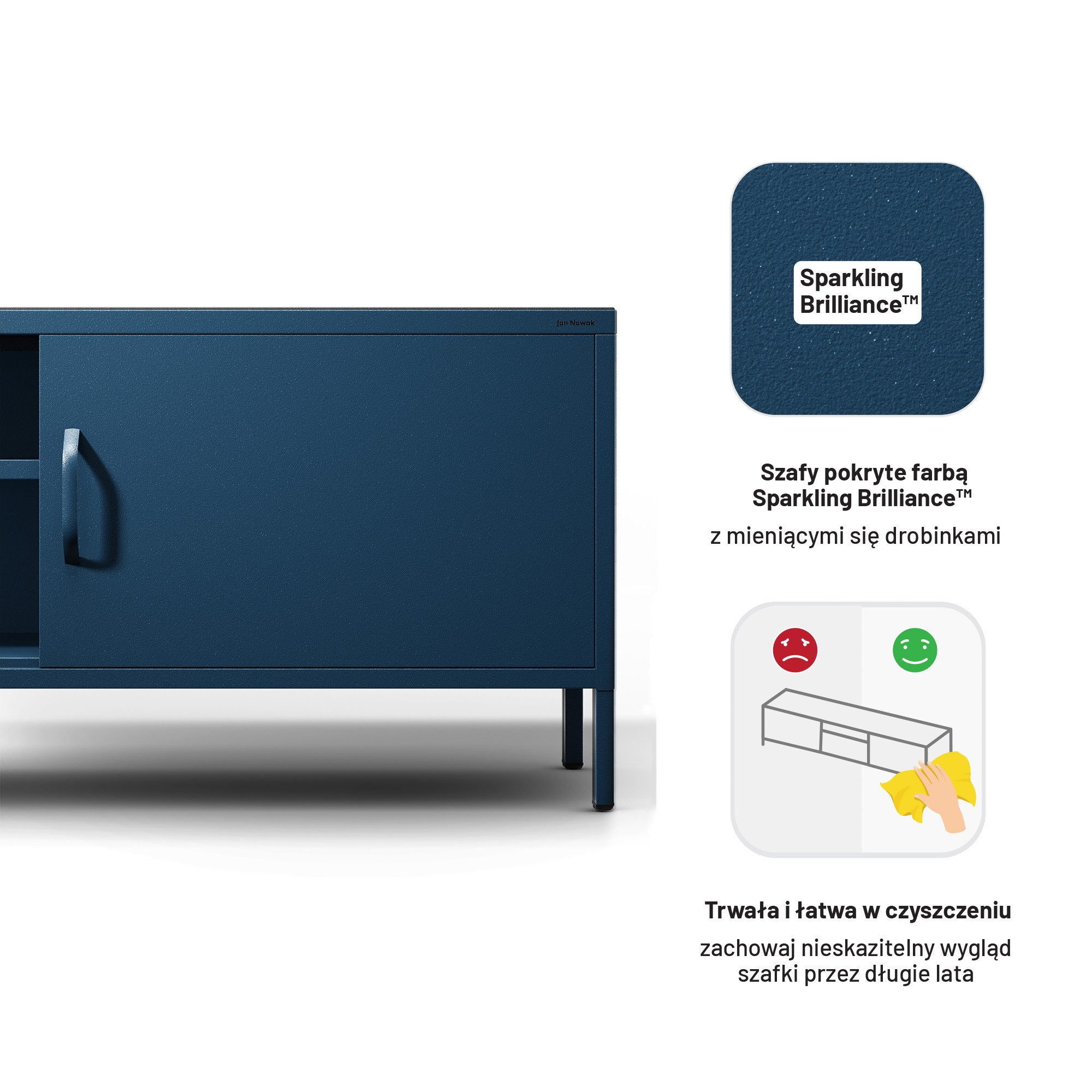 Zapomeňte na nudné barvy! Povrch TV skříňky ROSARIA okouzlí na první pohled díky speciální barvě Sparkling Brilliance™. Tato unikátní kombinace tmavě modré a třpytivých částeček vytváří dojem hvězdné oblohy a dodá vašemu interiéru jedinečný charakter. Jemné lesknutí nepůsobí rušivě a udrží si svůj krásný vzhled po dlouhá léta.