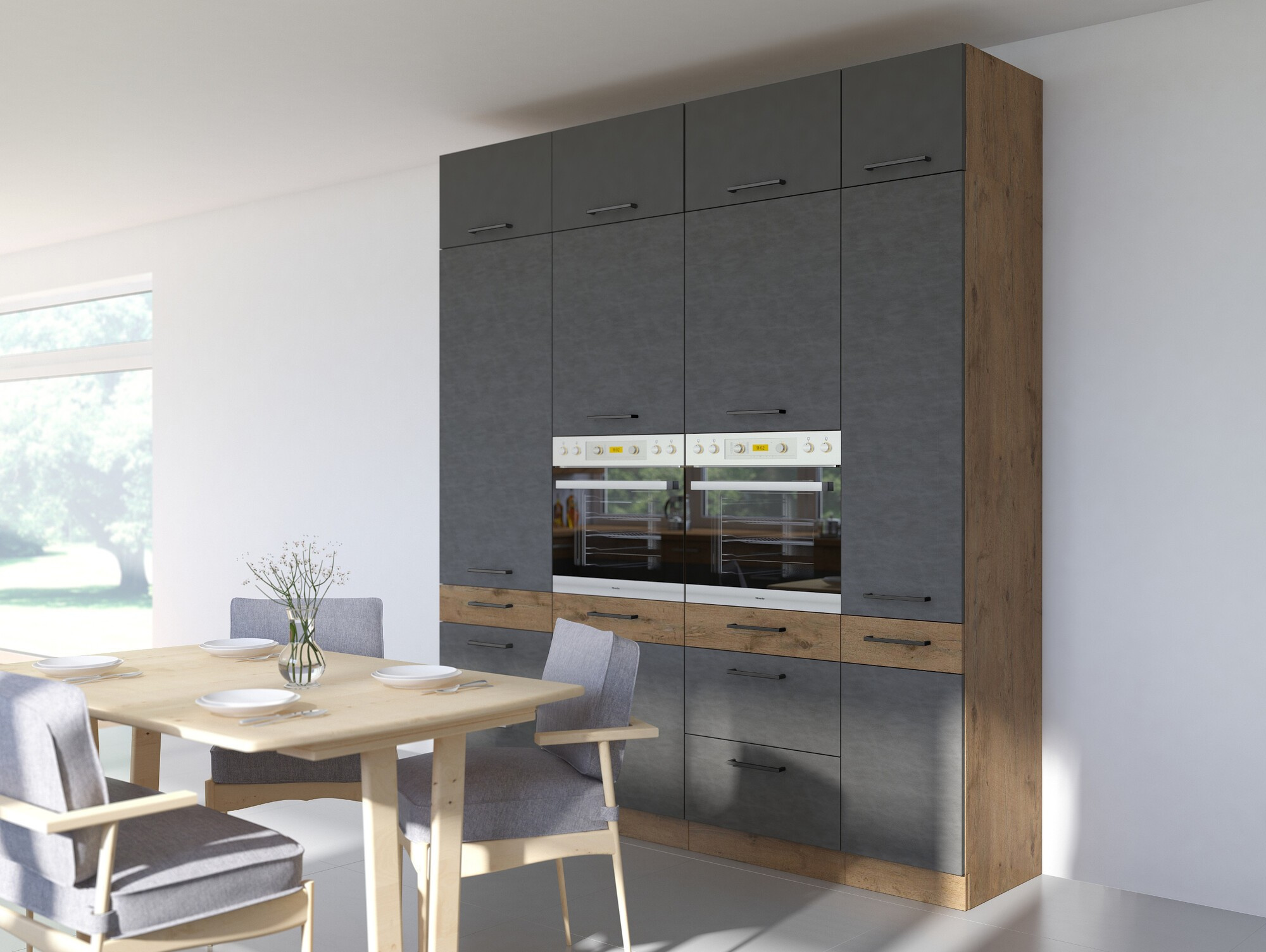 - Dvířka a čela šuplíků jsou vyrobeny z laminované desky 16 mm v kombinaci barev Dub Lancelot / Matera