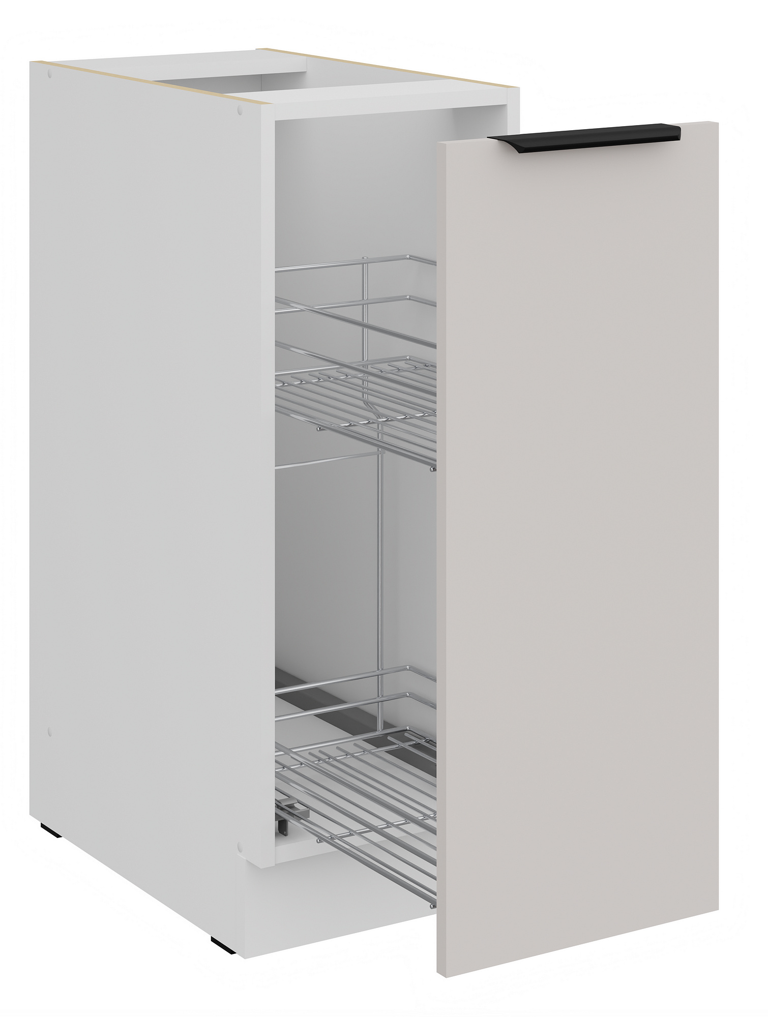 Dvířka skříňky jsou universální, což znamená, že je můžete namontovat jako pravé nebo levé, podle vašich potřeb a dispozice kuchyně. Vnitřek skříňky je v bílém provedení, což zajišťuje čistý a svěží vzhled.