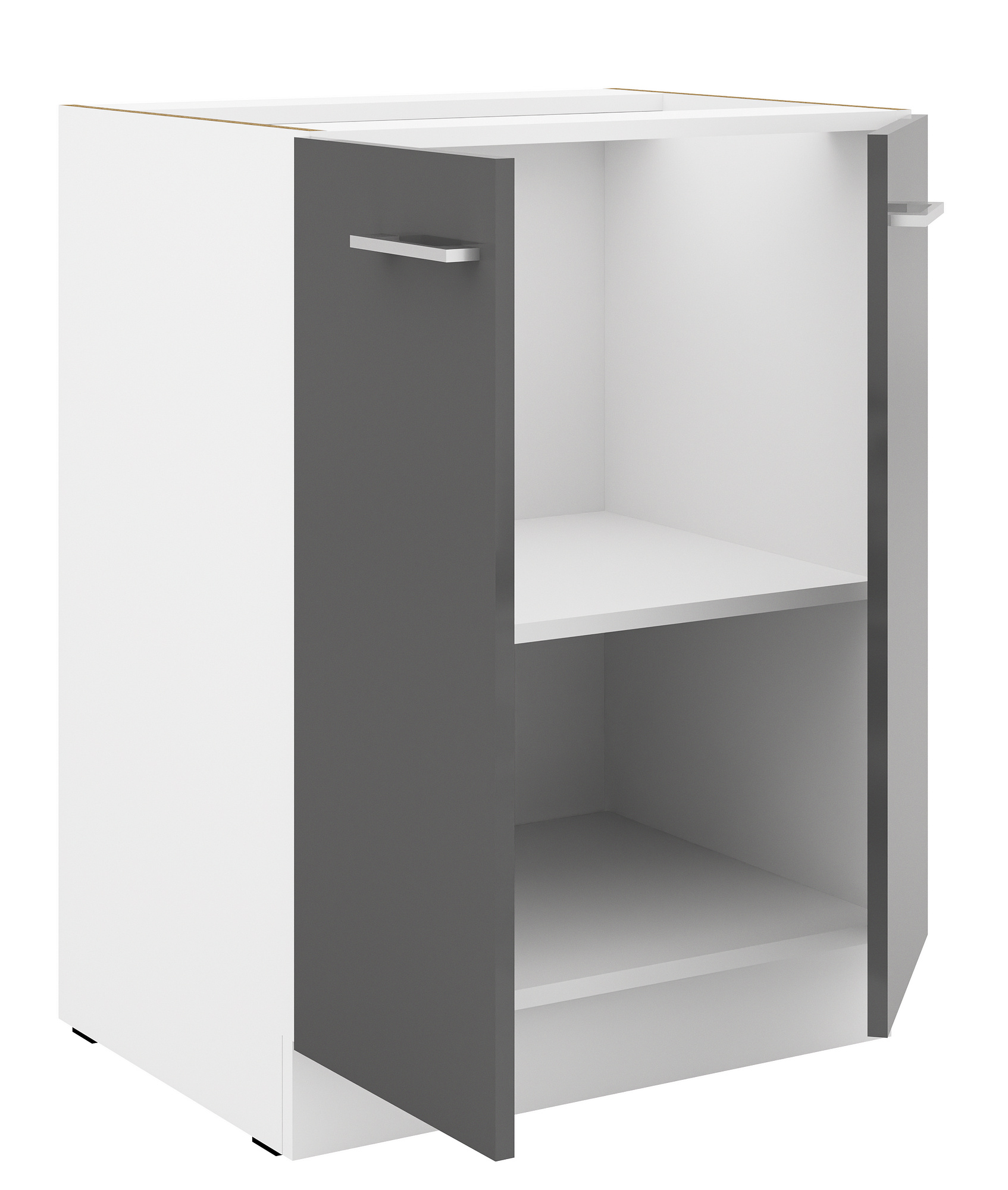 Dvířka a čela šuplíků jsou vyrobeny z materiálu PUR HG v elegantním šedém lesku, který dodává skříňce moderní vzhled. ABS hrany zajišťují dlouhou životnost a odolnost proti poškození. Dvířka lze namontovat jako pravé nebo levé, což poskytuje flexibilitu při instalaci.