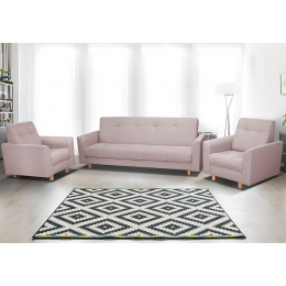 Sedací souprava Gala potěší milovníky Retro designu. Pohovka je rozkládací a samozřejmostí je i praktický úložný prostor. Retro styl podtrhují dřevěné nožky a prošití s vtahy. Je potažena látkou v pastelových barvách a můžete si vybrat ze 4 atraktivních odstínů. Výplň sedáku tvoří kombinace pružin bonell s kvalitní PUR pěnou. Jednoduchým rozložením pomocí systému klik-klak vznikne lůžko k občasnému přespání. Vyobrazené dekorace nejsou v ceně.