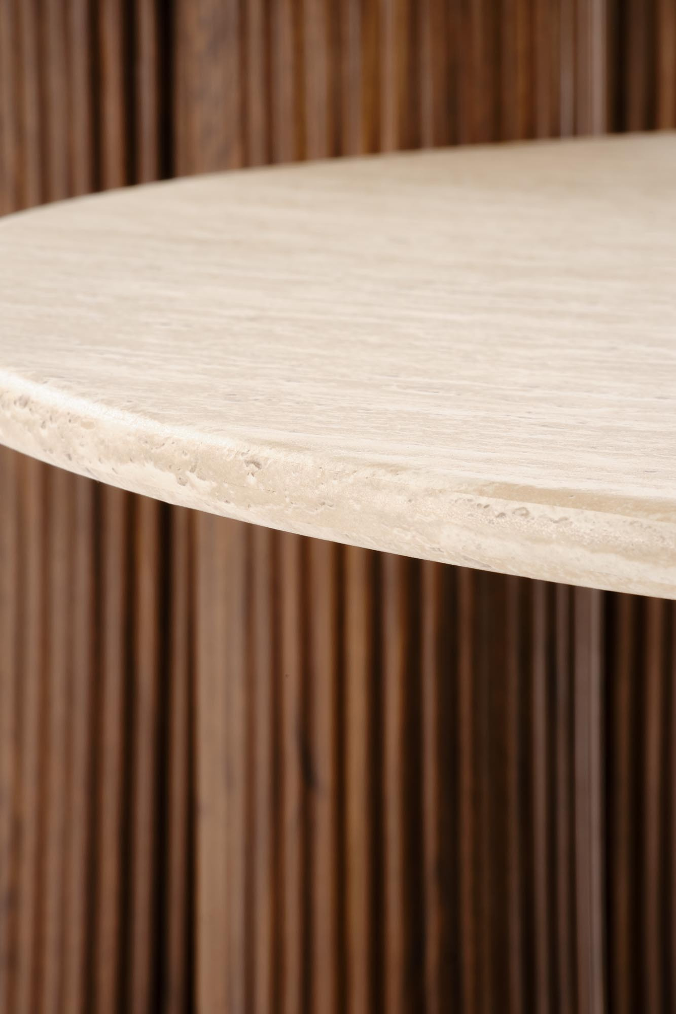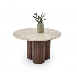 Konferenční stolek DOROTEA je vyroben z kvalitního MDF materiálu, který zajišťuje dlouhou životnost a odolnost. Povrchová úprava v kombinaci travertinu a ořechu dodává stolku luxusní vzhled, který se hodí do jakéhokoliv interiéru. Travertinová deska přináší do vašeho domova nádech přírody a elegance, zatímco ořechové detaily dodávají teplo a útulnost.
