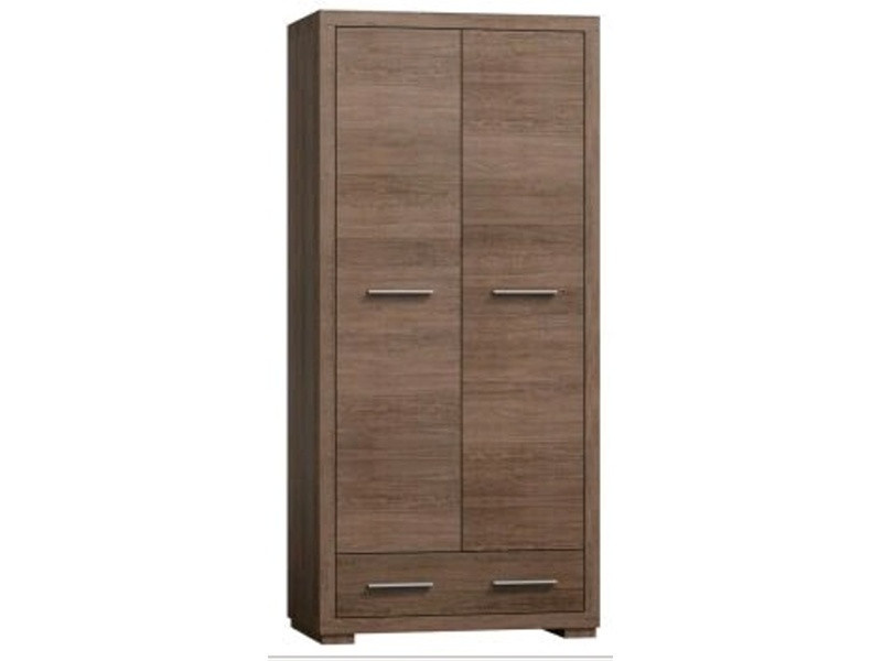 Dvoudveřová šatní skříň z kolekce Vegas. Má uprostřed tyč, která umožňuje vyplnit volný prostor nábytku. Pod ní se nachází zásuvka, která pojme mnoho oblečení, dokumentů nebo jiných doplňků. Kovové úchytky splývají s celým kusem nábytku a dokonale podtrhují jeho asertivní charakter. Hodí se do obývacího pokoje, ložnice i pracovny.