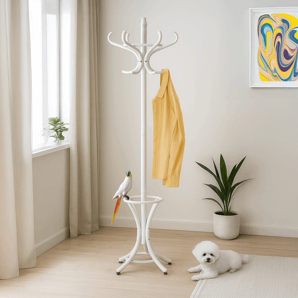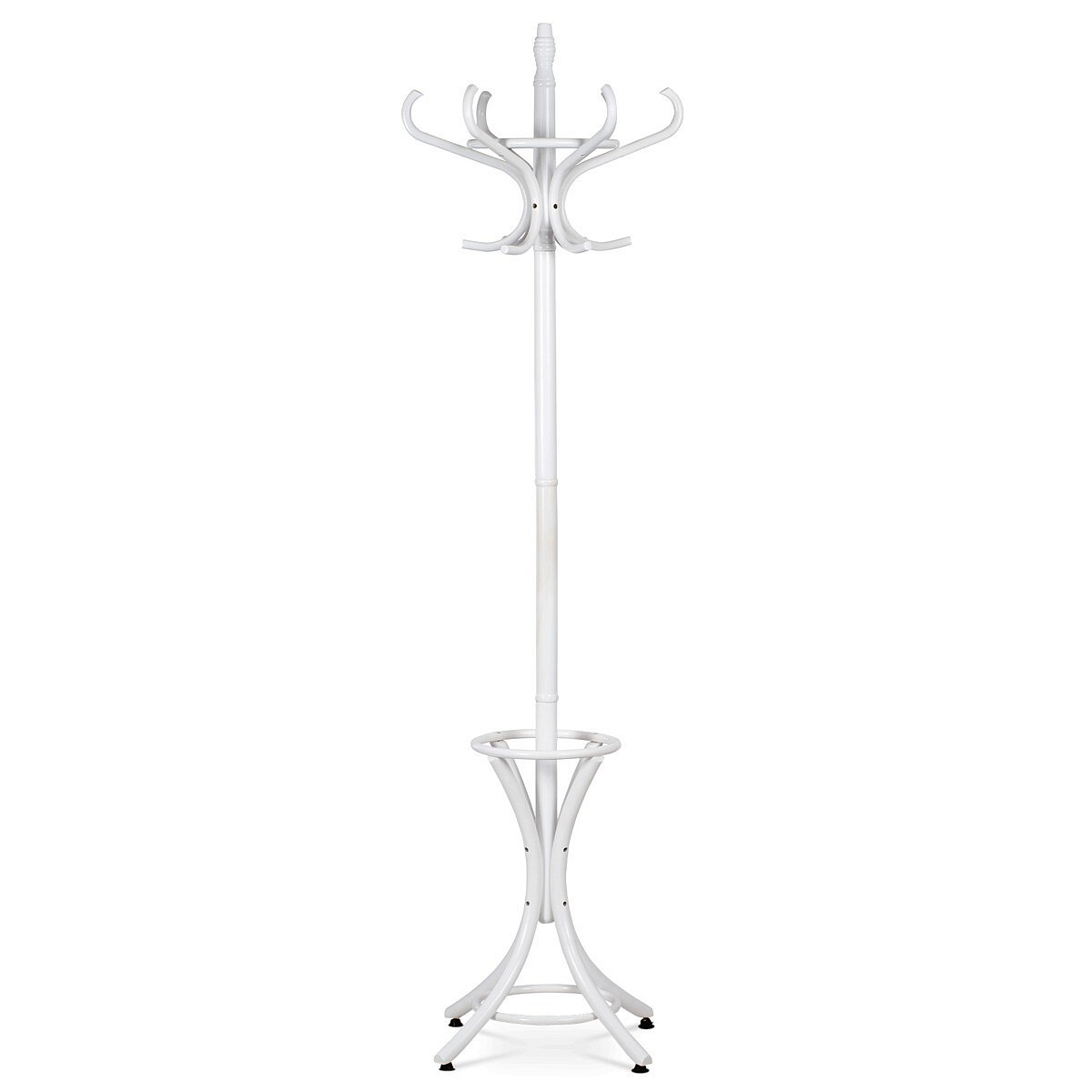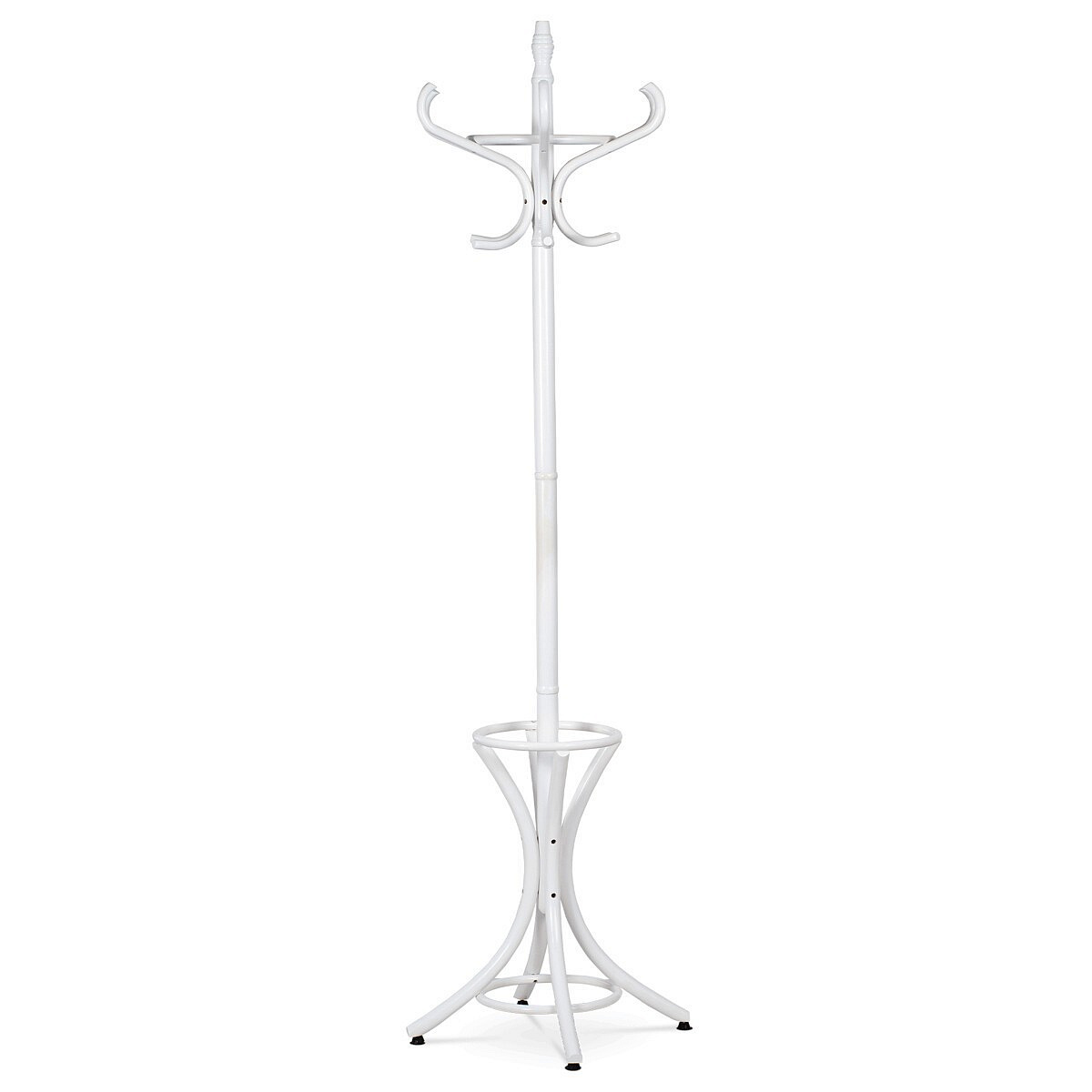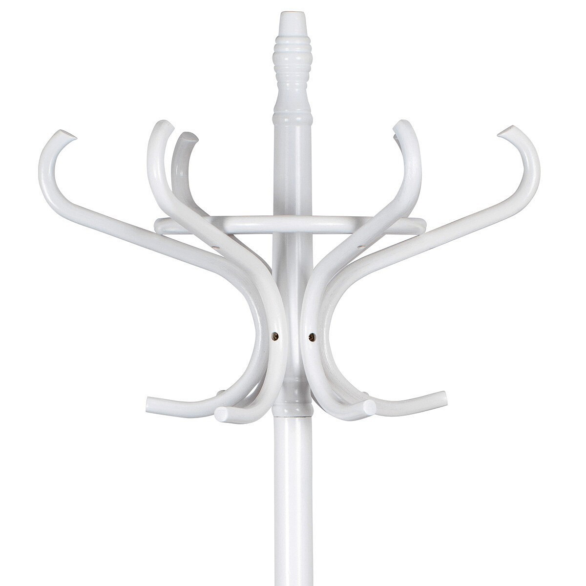 Stojanový věšák z masivu v bílé matné úpravě kombinuje pevnost topolu a břízy s tradičním designem. Jeho tělo tvoří hladce opracované dřevěné prvky, které jsou spojeny do stabilní základny se čtyřmi nohami zakončenými ochrannými kluzáky. Horní část nabízí osm zakřivených háčků pro pohodlné zavěšení kabátů, klobouků či šál. Výška 185 cm umožňuje snadný přístup a zároveň šetří prostor v předsíni či kanceláři. Díky kvalitnímu matnému laku je povrch příjemný na dotek a snadno se udržuje.