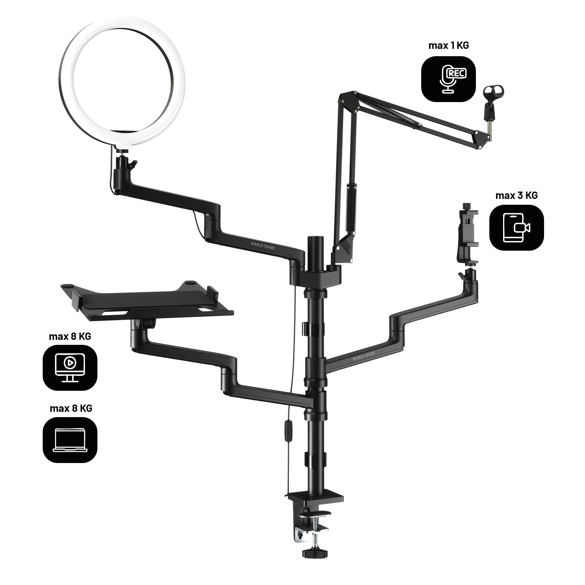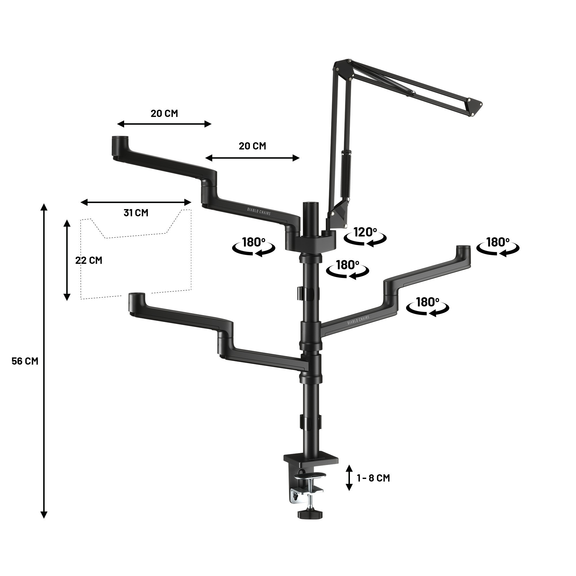 - Čtyři odolná, konfigurovatelná ramena: Pro maximální flexibilitu a přizpůsobení.