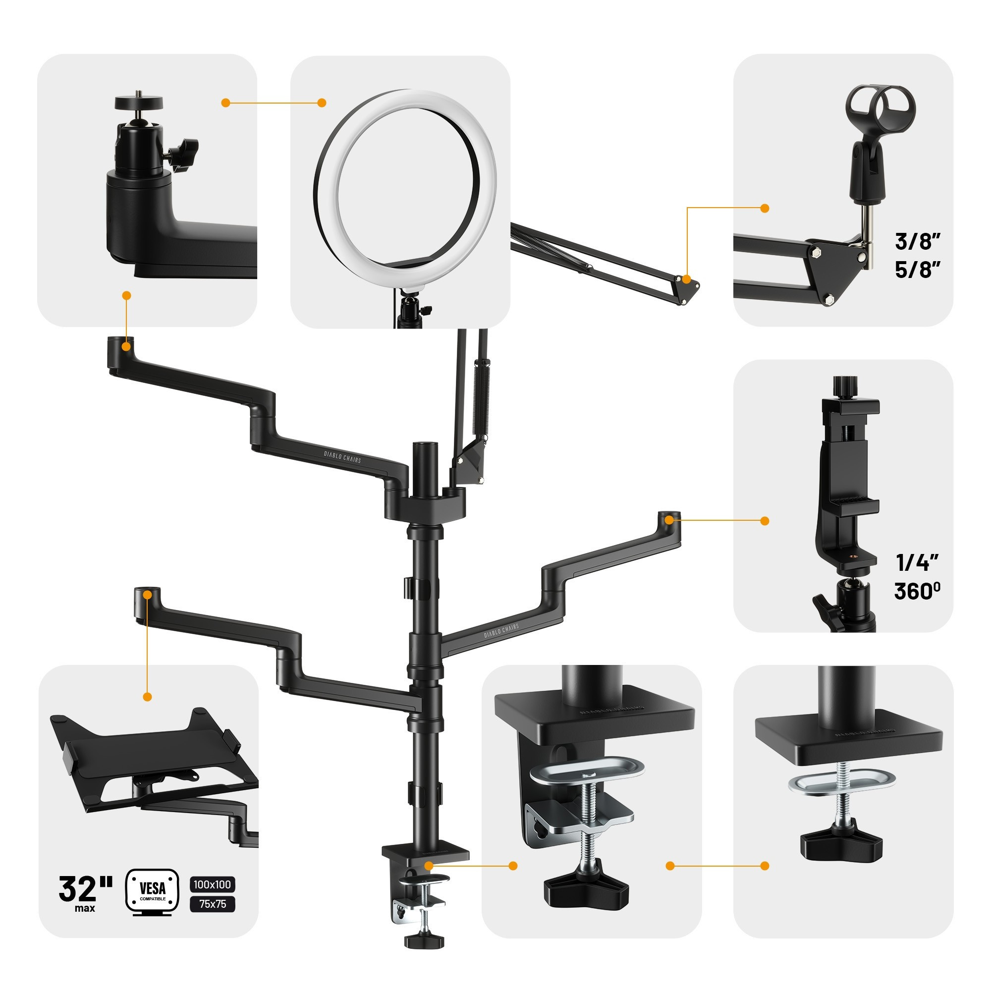 X-Stream je navržen tak, aby byl kompatibilní s většinou zařízení na trhu. Ať už používáte profesionální kameru, USB mikrofon, kruhové světlo nebo tablet, X-Stream vám poskytne stabilní a bezpečné uchycení. Součástí balení je i sada adaptérů, která zajišťuje maximální flexibilitu a umožňuje vám přizpůsobit držák vašim specifickým potřebám. Můžete bezpečně upevnit notebook (11.6-17.3 palce) nebo monitor (17-32 palců) ve standardu VESA.