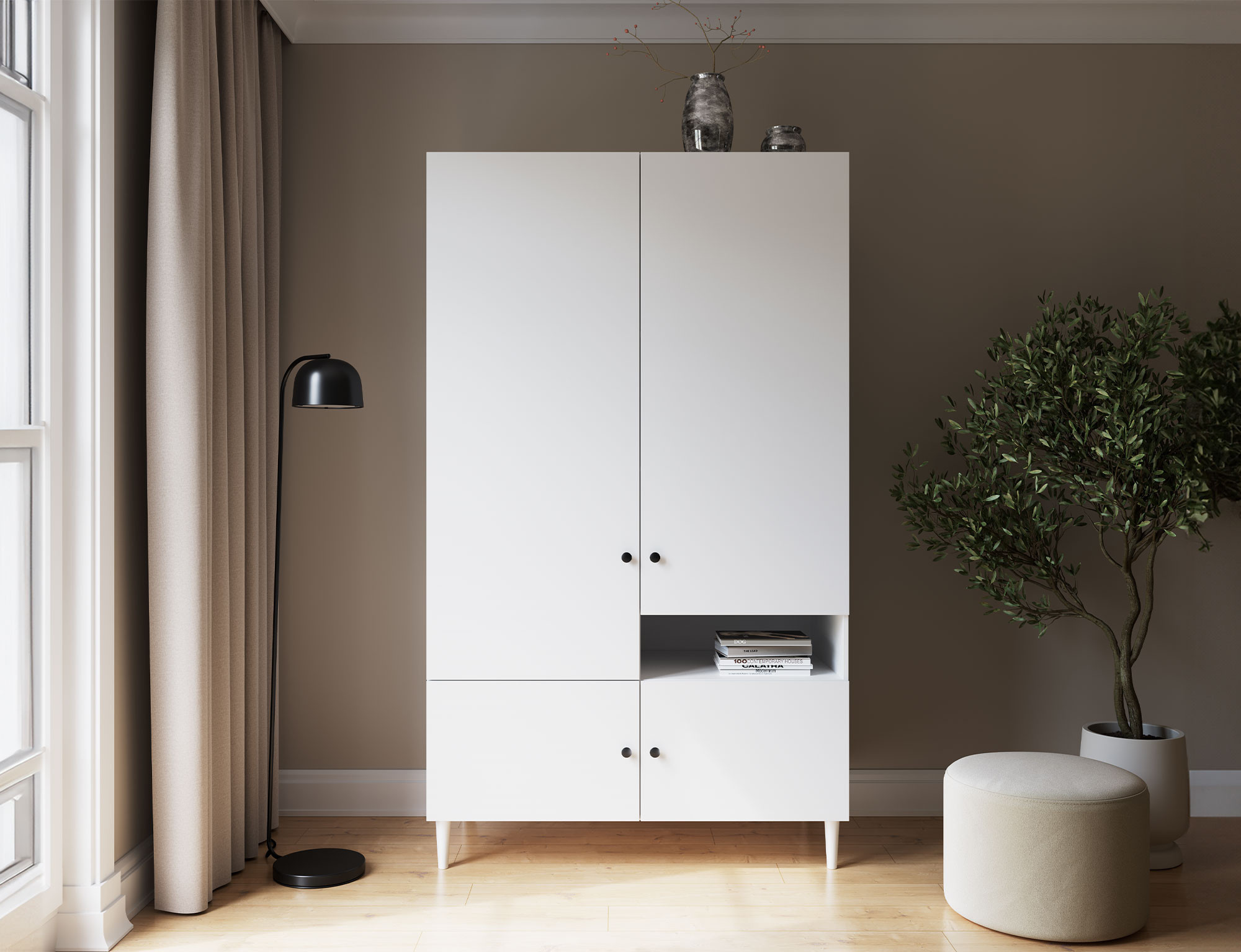 Šatní skříň Dullum je elegantní a prostorný kus nábytku s rozměry 120x205x60 cm. Má pevné dřevěné nohy, které jsou vysoké 15 cm, což zajišťuje stabilitu a stylový vzhled. Jeho velkorysý design nabízí dostatek prostoru pro uložení oblečení a dalších věcí, zatímco jeho sofistikovaný povrch zajišťuje, že doplňuje různé styly interiéru a přidává moderní nádech.