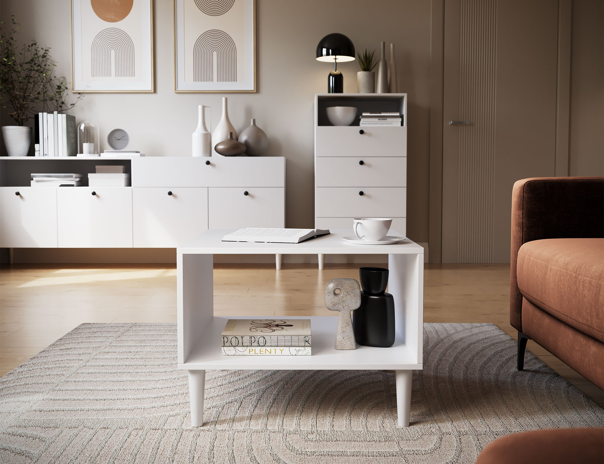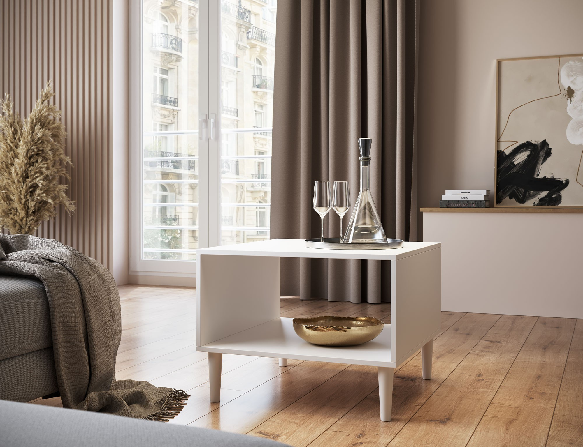 Konferenční stolek Dullum je elegantní a moderní kus nábytku s rozměry 60 cm na 60 cm a výškou 45 cm. Stůl stojí na pevných dřevěných nohách, které jsou 15 cm vysoké, což mu dodává lehký a stylový vzhled. Jeho kompaktní velikost a minimalistický design z něj činí ideální doplněk pro jakýkoli interiér, sloužící jak praktickým, tak dekorativním účelům.