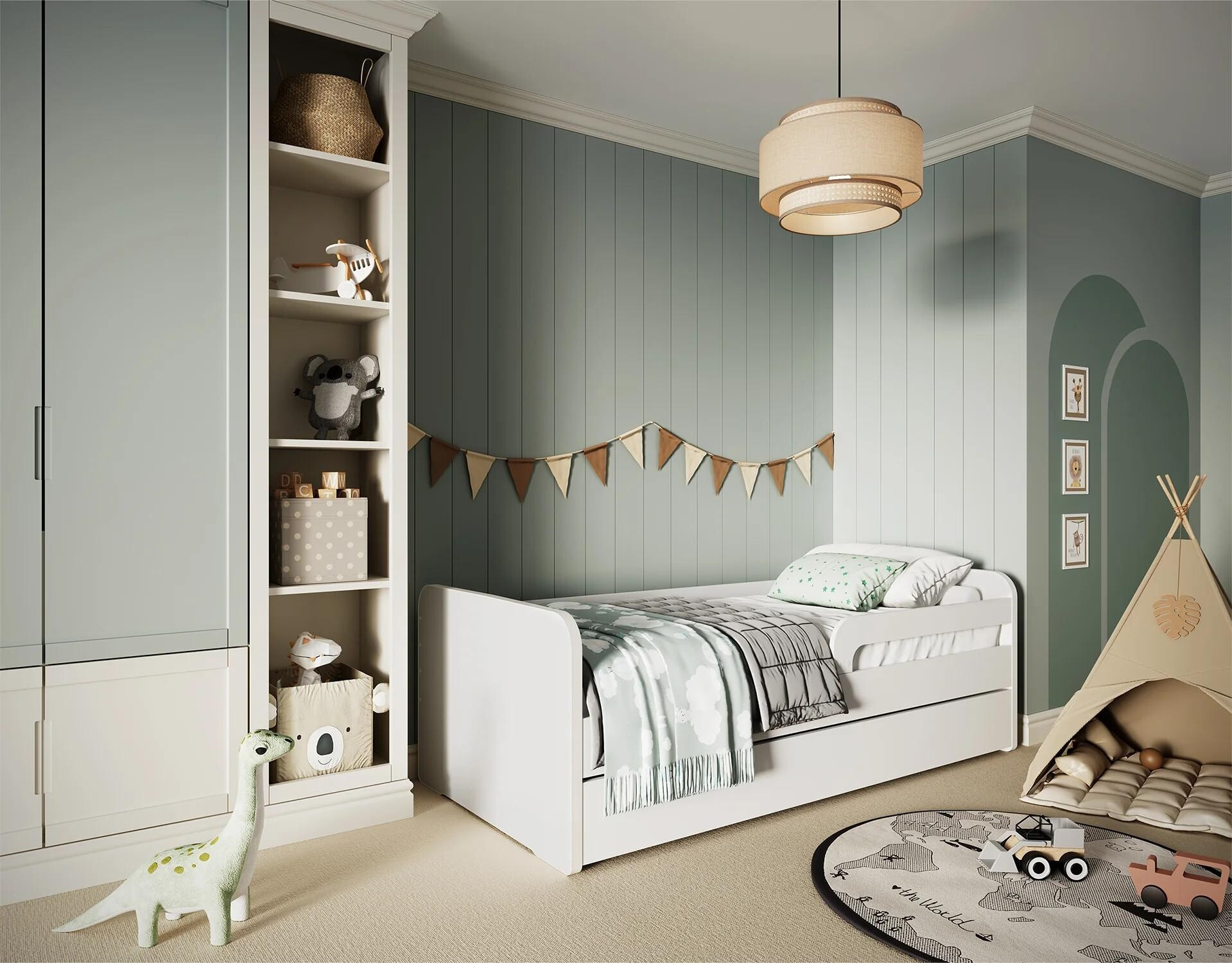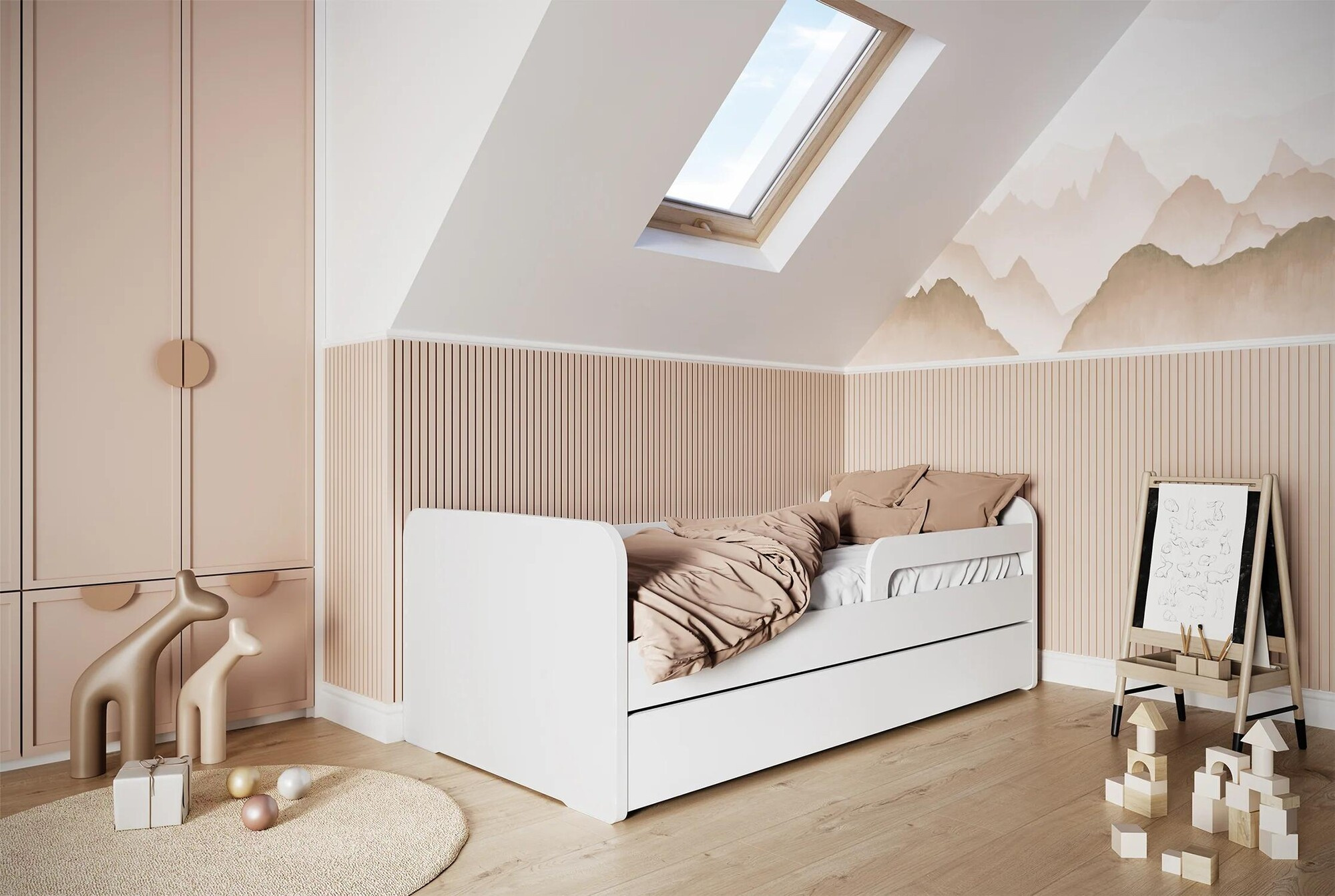 Dětská postel Duuli je moderní kus nábytku s univerzálním designem, který se dokonale hodí do interiéru každého dětského pokoje. Robustní rám v klasické bílé barvě dodává lehkost a eleganci, čímž zdůrazňuje jeho nadčasový charakter. Postel je vybavena bezpečnostní zábranou, která zajišťuje úplnou bezpečnost během spánku a chrání dítě před náhodným pádem. Dostupné ve dvou variantách – s matrací nebo bez matrace – umožňuje přizpůsobení individuálním potřebám. Absence ložního kontejneru činí konstrukci lehkou, jednoduchou a dokonale vhodnou pro minimalistický, moderní styl. Postel Duuli kombinuje estetiku, funkčnost a bezpečnost, což z ní činí ideální řešení pro pohodlný odpočinek vašeho dítěte.