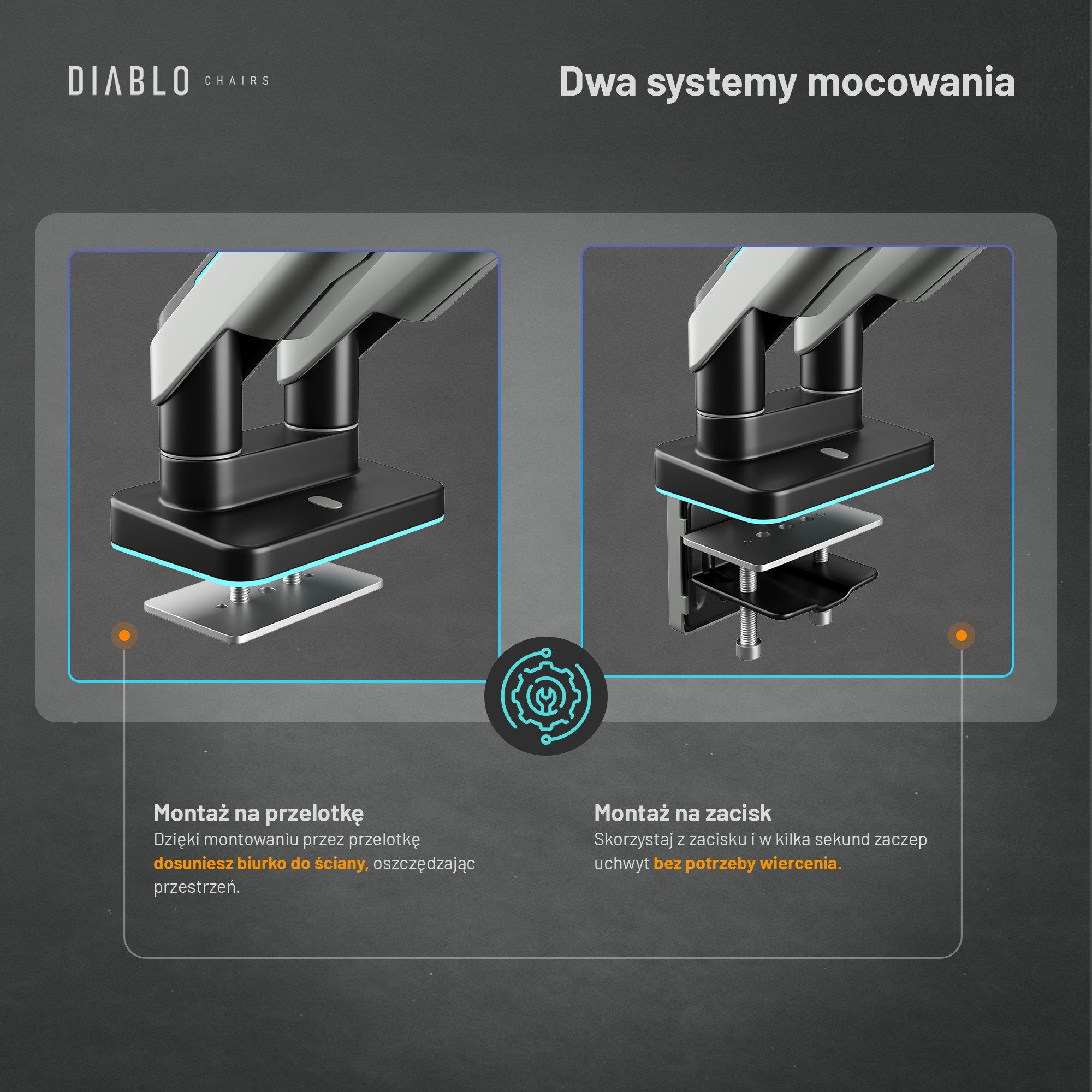 RGB X-Arm Dual nabízí dva způsoby montáže: pomocí svorky nebo průchodky. Vyberte si ten, který vám nejvíce vyhovuje a který se nejlépe hodí k vašemu stolu. Svorka je ideální pro desky o tloušťce od 10 do 85 mm, zatímco průchodka je vhodná pro desky o tloušťce od 10 do 48 mm. Ať už si vyberete jakýkoliv způsob montáže, instalace je rychlá a jednoduchá.