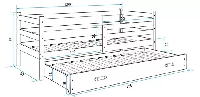 Dětská postel ERYK s přistýlkou 90x200 cm, bez matrace, Grafit/Bílá