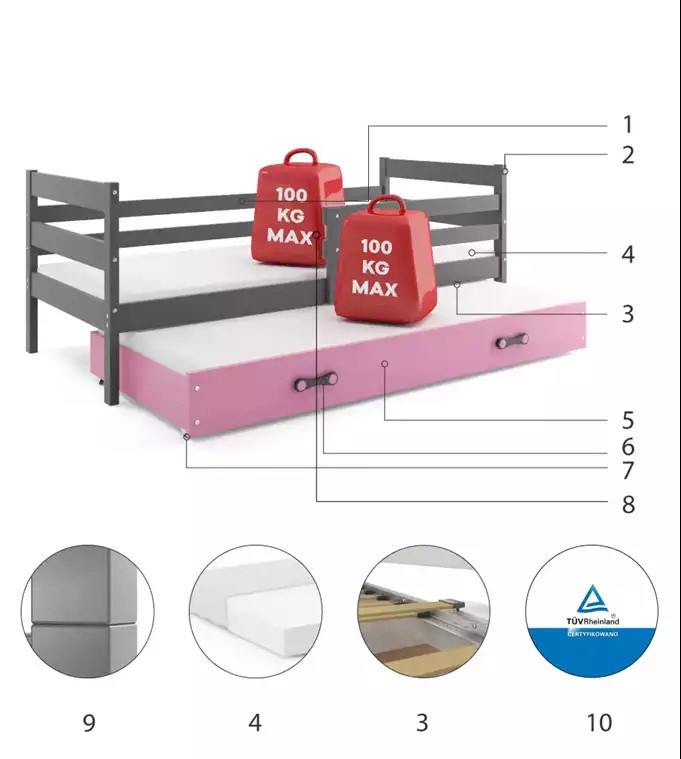 Dětská postel ERYK s přistýlkou 80x190 cm, bez matrace, Grafit/Růžová