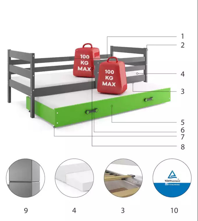 Dětská postel ERYK s přistýlkou 90x200 cm, bez matrace, Grafit/Zelená