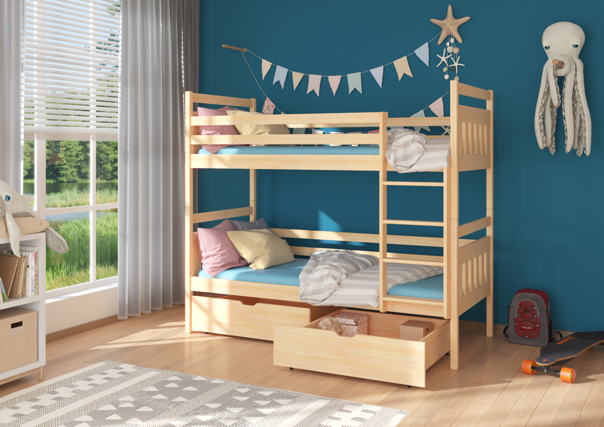 Patrová 2-osobová postel ADA je skvělý nápad na úsporu místa v malém dětském pokoji. Model je dostupný ve dvou velikostech a v mnoha barvách, které se hodí do každého uspořádání. Nábytek má schůdkový žebřík a dvě prostorné a funkční zásuvky na ložní prádlo. Matrace nejsou součástí postele.