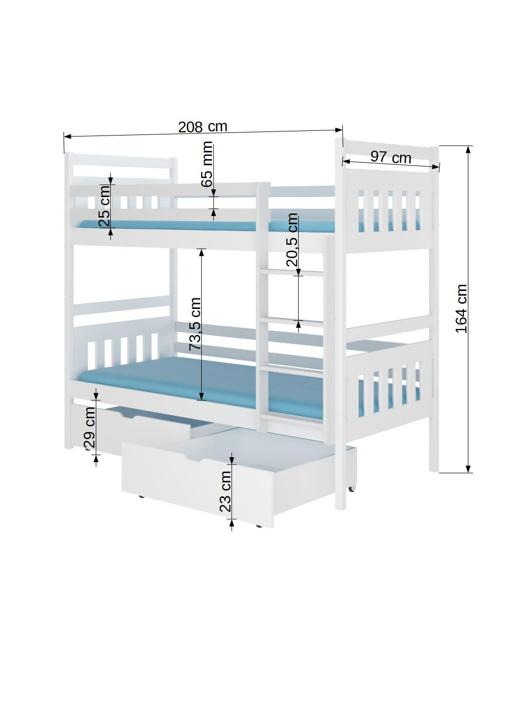 Patrová 2-osobová postel ADA je skvělý nápad na úsporu místa v malém dětském pokoji. Model je dostupný ve dvou velikostech a v mnoha barvách, které se hodí do každého uspořádání. Nábytek obsahuje schůdkový žebřík a dvě prostorné a funkční zásuvky na ložní prádlo. Matrace nejsou součástí postele.