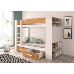 Patrová 2-lůžková postel GARET je skvělý nápad na úsporu místa v malém dětském pokoji. Nábytek obsahuje schůdkový žebřík a dvě prostorné a funkční zásuvky na ložní prádlo. Navíc na dvou úrovních byly namontovány zábradlí zvyšující bezpečnost během spánku. Model GARET má police umístěné jak z vnitřní, tak z vnější strany postele. Matrace nejsou součástí postele.