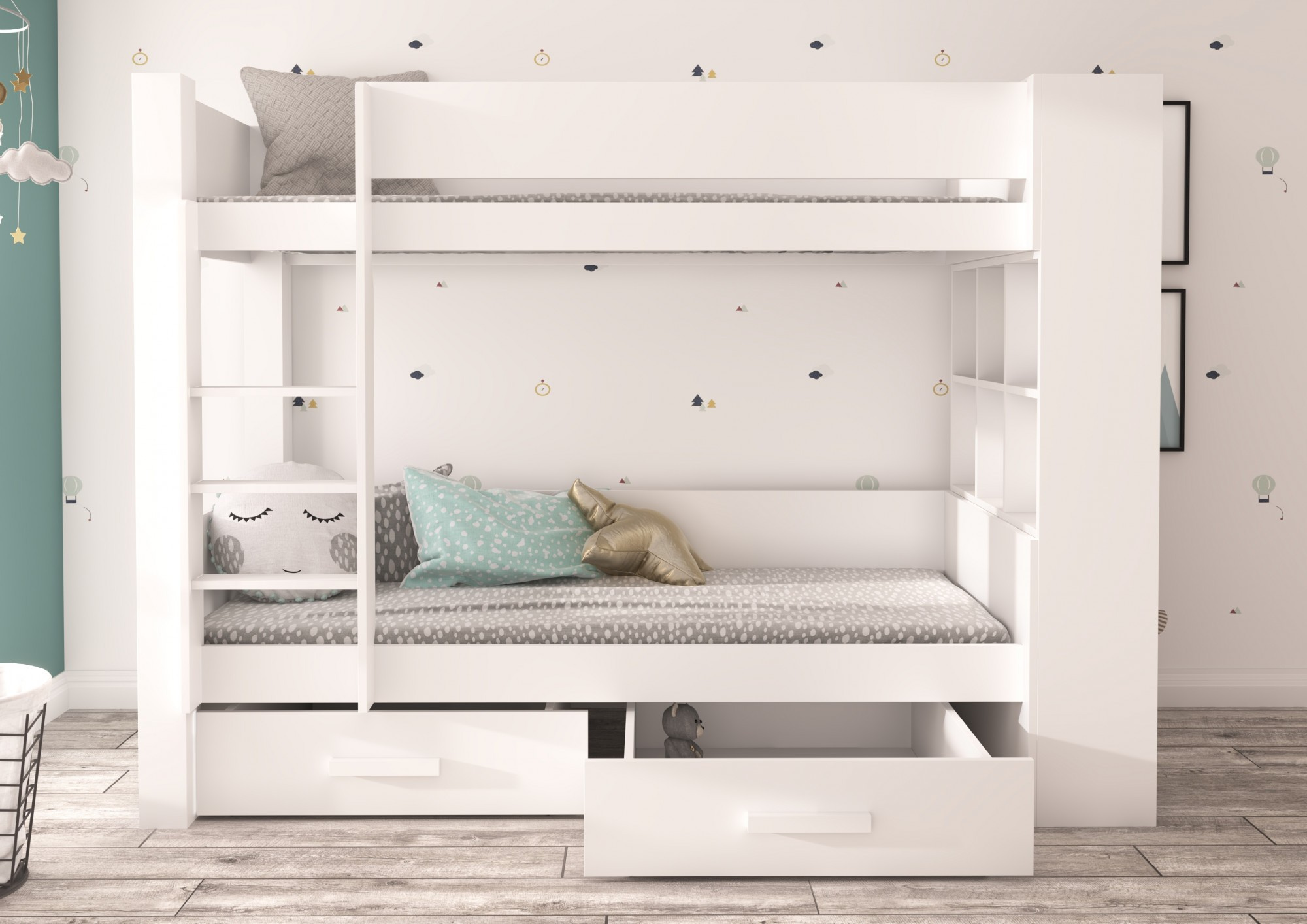 Patrová 2-lůžková postel GARET je skvělý nápad na úsporu místa v malém dětském pokoji. Nábytek obsahuje schůdkový žebřík a dvě prostorné a funkční zásuvky na ložní prádlo. Navíc na dvou úrovních byly namontovány zábradlí zvyšující bezpečnost během spánku. Model GARET má police umístěné jak z vnitřní, tak z vnější strany postele. Součástí sady je sada dvou pěnových matrací o tloušťce 8 cm.