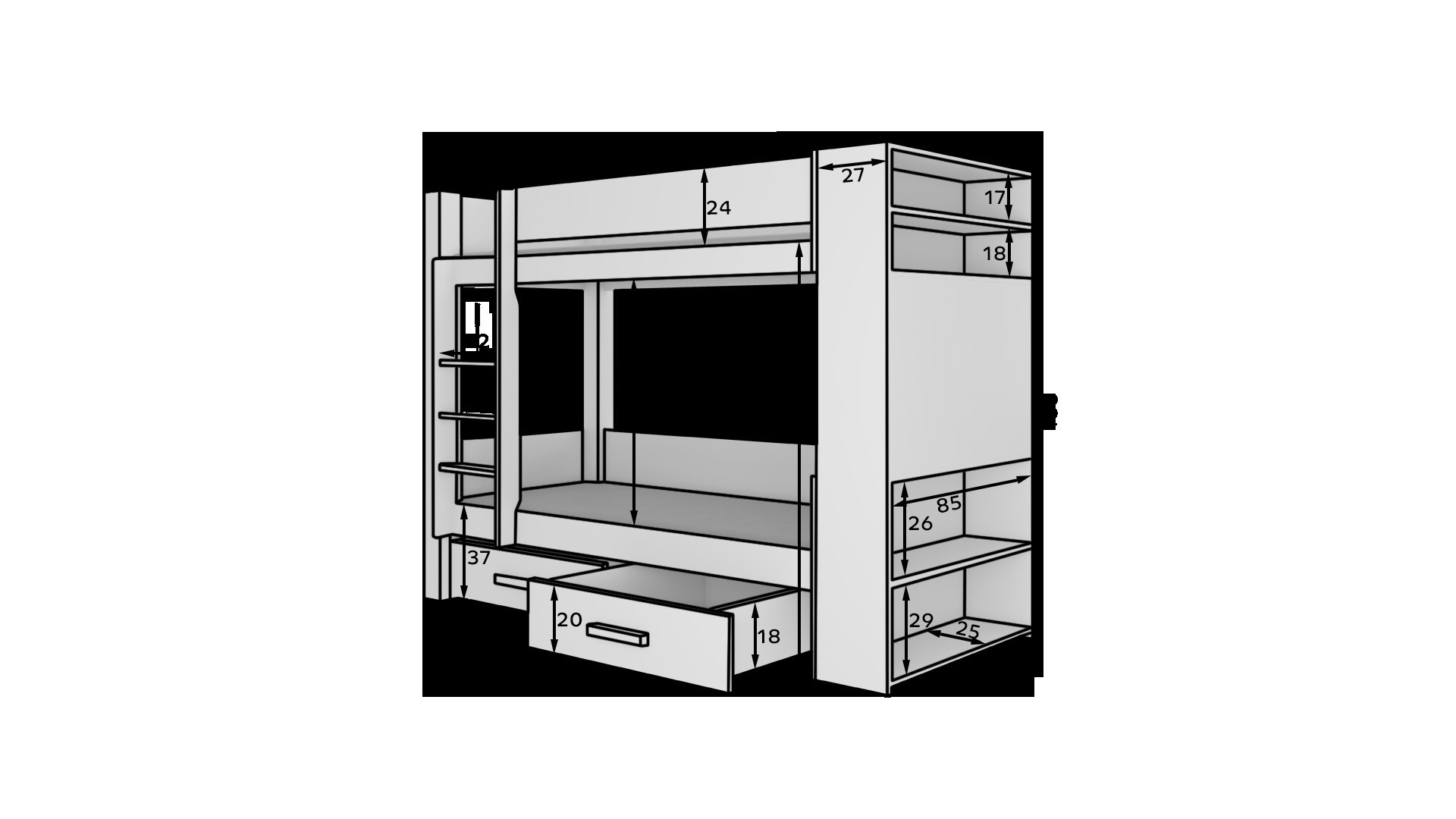 Patrová 2-lůžková postel GARET je skvělý nápad na úsporu místa v malém dětském pokoji. Nábytek obsahuje schůdkový žebřík a dvě prostorné a funkční zásuvky na ložní prádlo. Navíc na dvou úrovních byly namontovány zábradlí zvyšující bezpečnost během spánku. Model GARET má police umístěné jak z vnitřní, tak z vnější strany postele. Součástí sady je sada dvou pěnových matrací o tloušťce 8 cm.