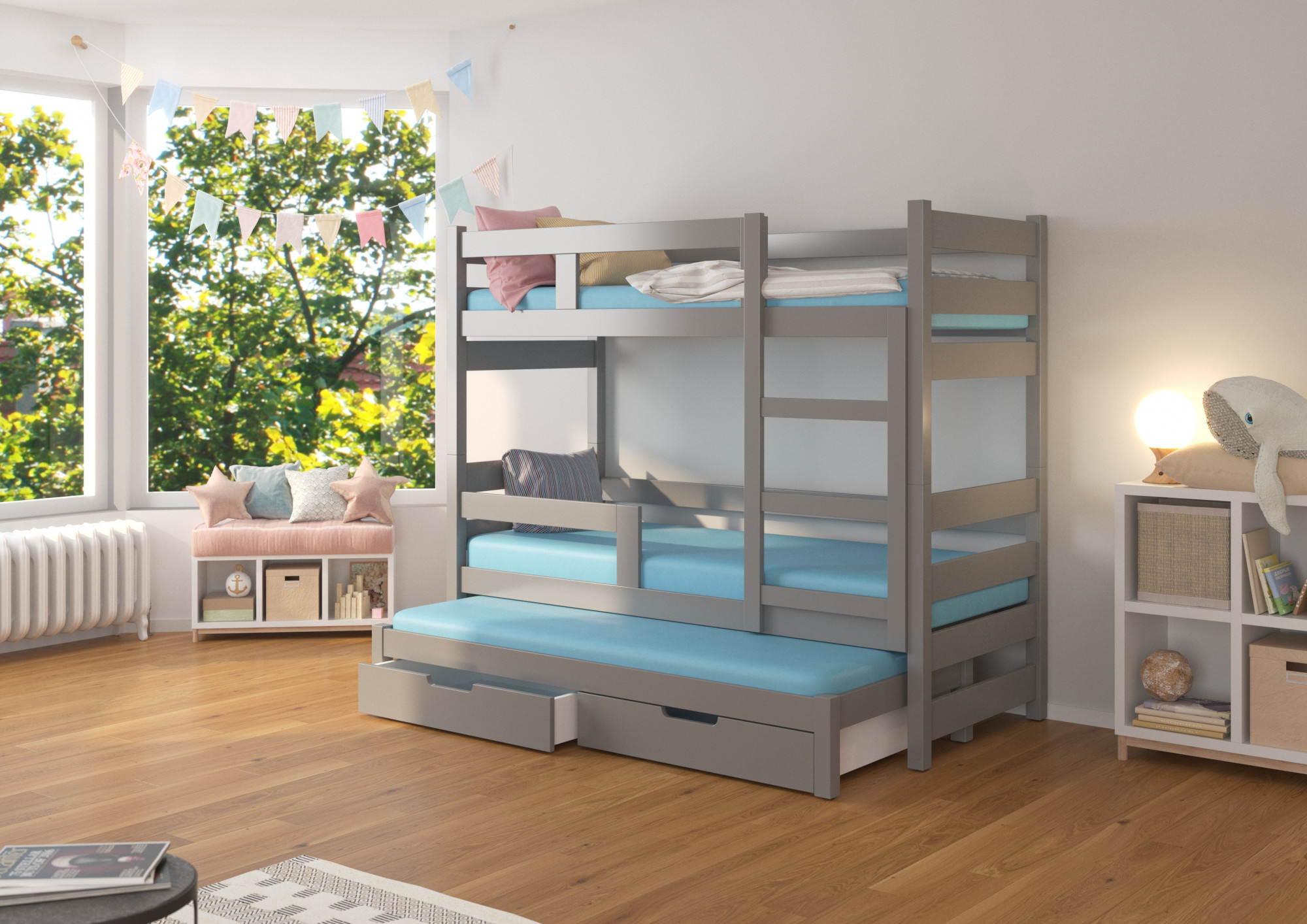 Patrová 3lůžková postel KARLO je skvělý nápad na úsporu místa v malém dětském pokoji. Nábytek má stabilní schůdkový žebřík a ochranné zábradlí umístěné téměř na každé straně postele, díky kterým máte jistotu, že vaše dítě je během spánku plně v bezpečí. Navíc dole se nacházejí dvě prostorné a funkční zásuvky na ložní prádlo. Spolu s postelí obdržíte sadu tří pěnových matrací s bavlněnými potahy na zip.