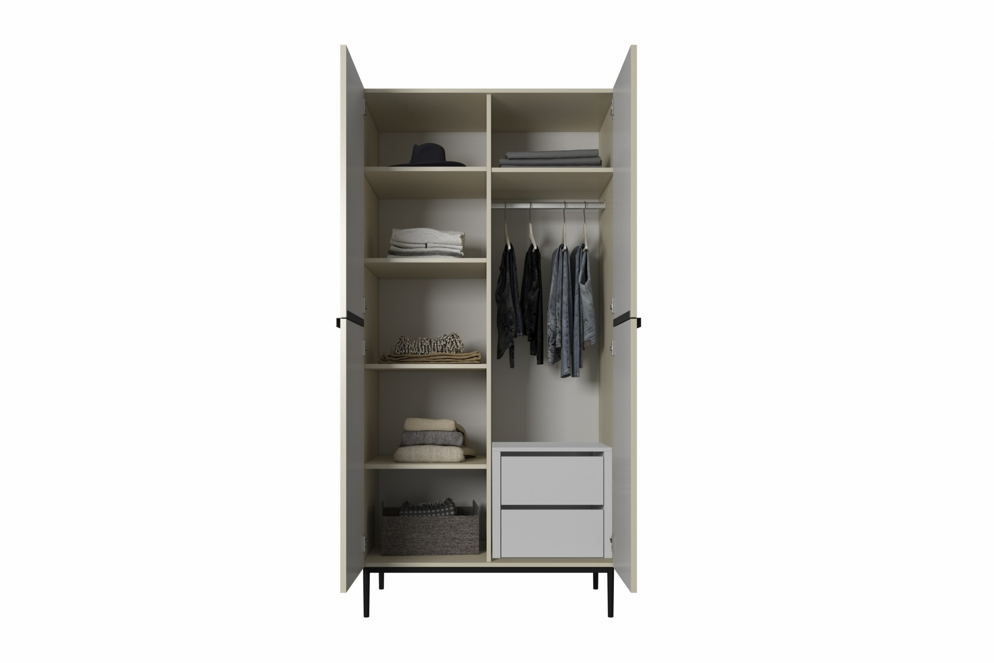 Dvoudveřová skříň Nicole se skrytými zásuvkami a kovovými nohami 100 cm - kašmír / černé nožky, Šířka: 100, Výška: 220, Hloubka: 62, Výška nožek: 20, Hloubka desky: , Montáž:
