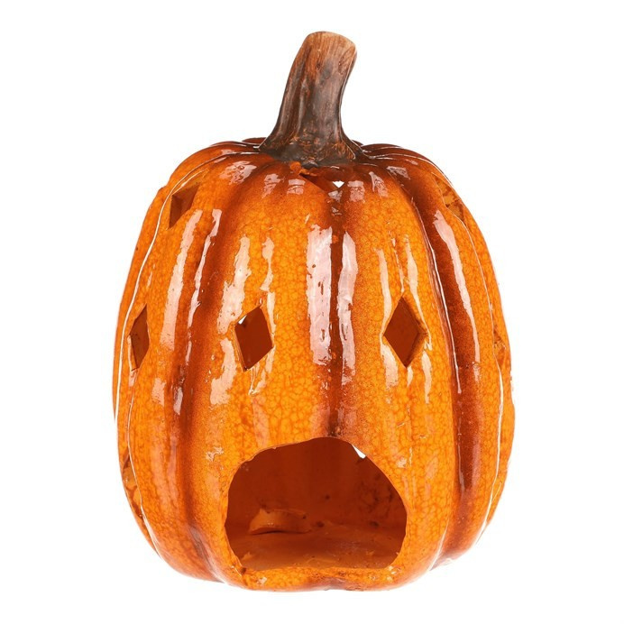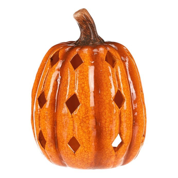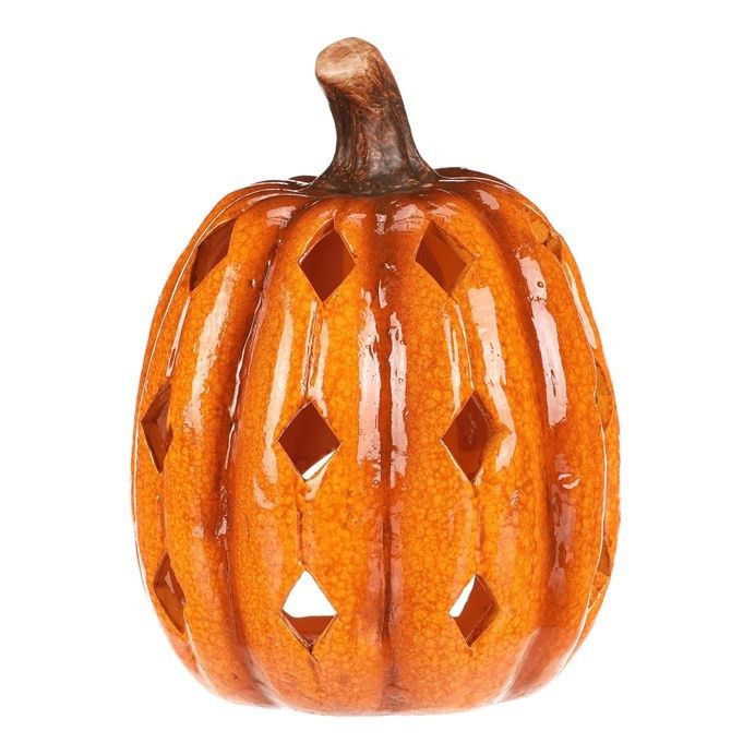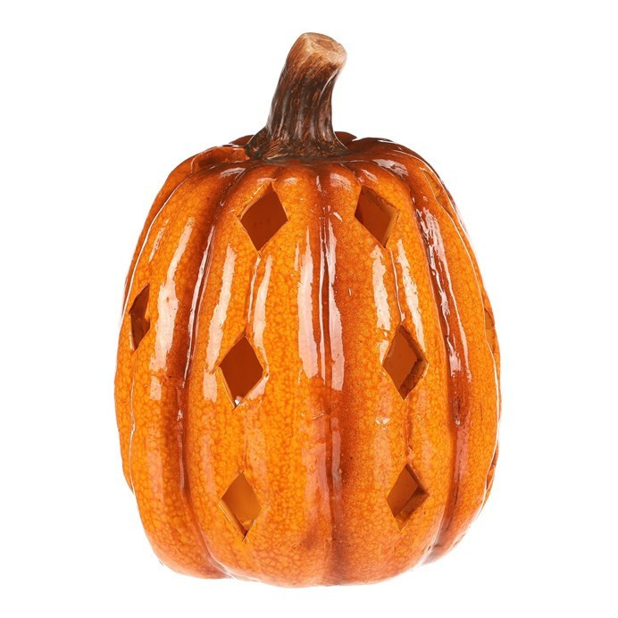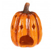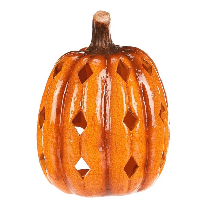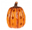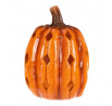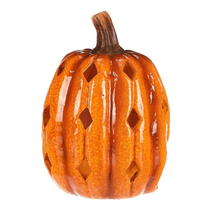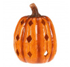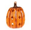 Žluto-oranžová dýně z keramiky s lesklým povrchem a prostorem pro vložení svíčky navodí tu pravou podzimní atmosféru. Po obvodu se nachází hranaté otvory soustředěné v pruzích, kterými budou po zapálení knotu efektně procházet paprsky světla.
