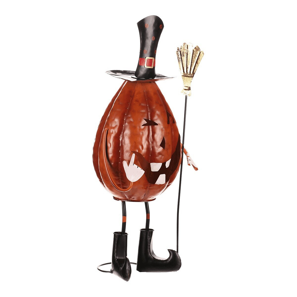 Oranžová kovová dýně s kloboukem a smetákem sice vypadá strašidelně, ale její veselý výraz napoví, že to s tou hrůzou nebude tak zlé. Ideální dekorace na Halloween i podzimní večery, která potěší každého, kdo má rád trochu tajemna s úsměvem.