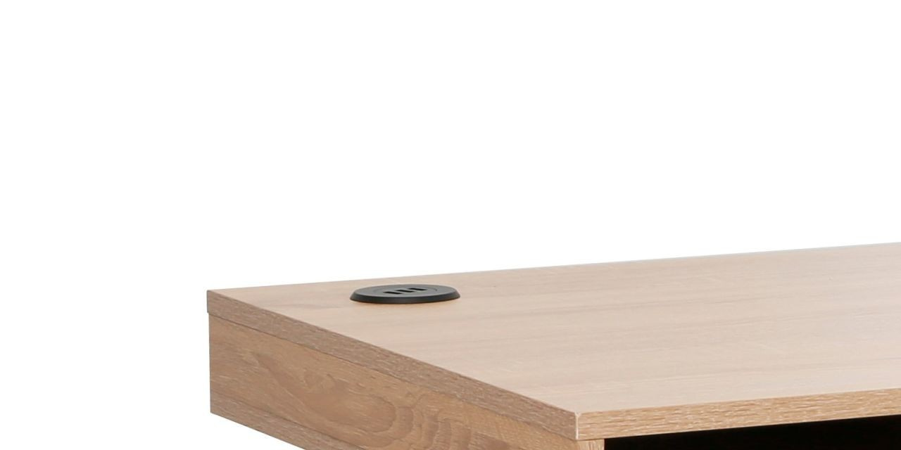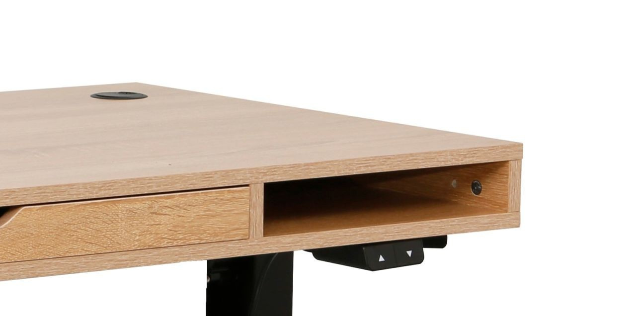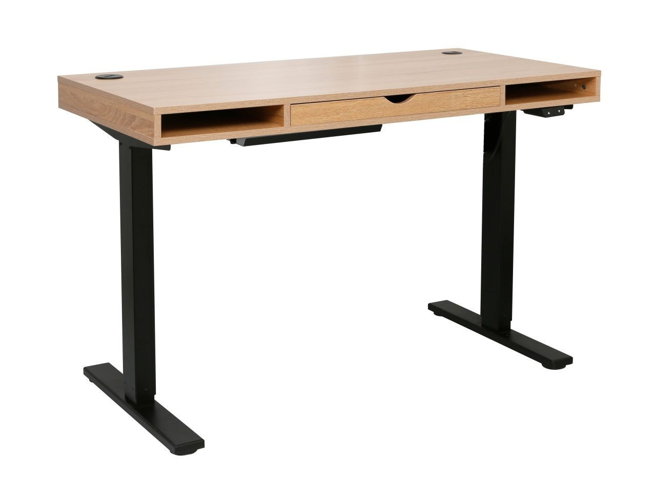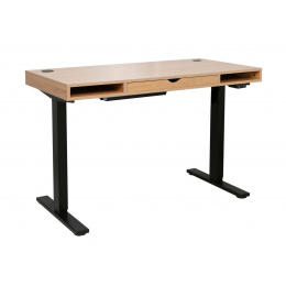 ROZMĚRY: - hloubka: 60 cm - šířka: 120 cm - výška (elektricky nastavitelná): 76-122 cm MATERIÁL: - deska: MDF + dýha - rám: kov lakovaný práškovou barvou BARVA: - deska: přírodní dub - rám: černý OSTATNÍ: - plynulé elektrické nastavení výšky - tichý elektrický motor - dvě police a jedna zásuvka - nastavitelné nožky - organizér na kabely (pod deskou) - průchodka na kabely (v desce) - tři USB porty (v desce)