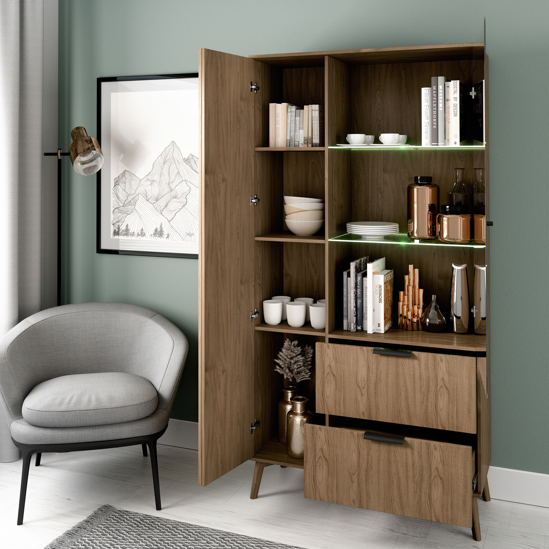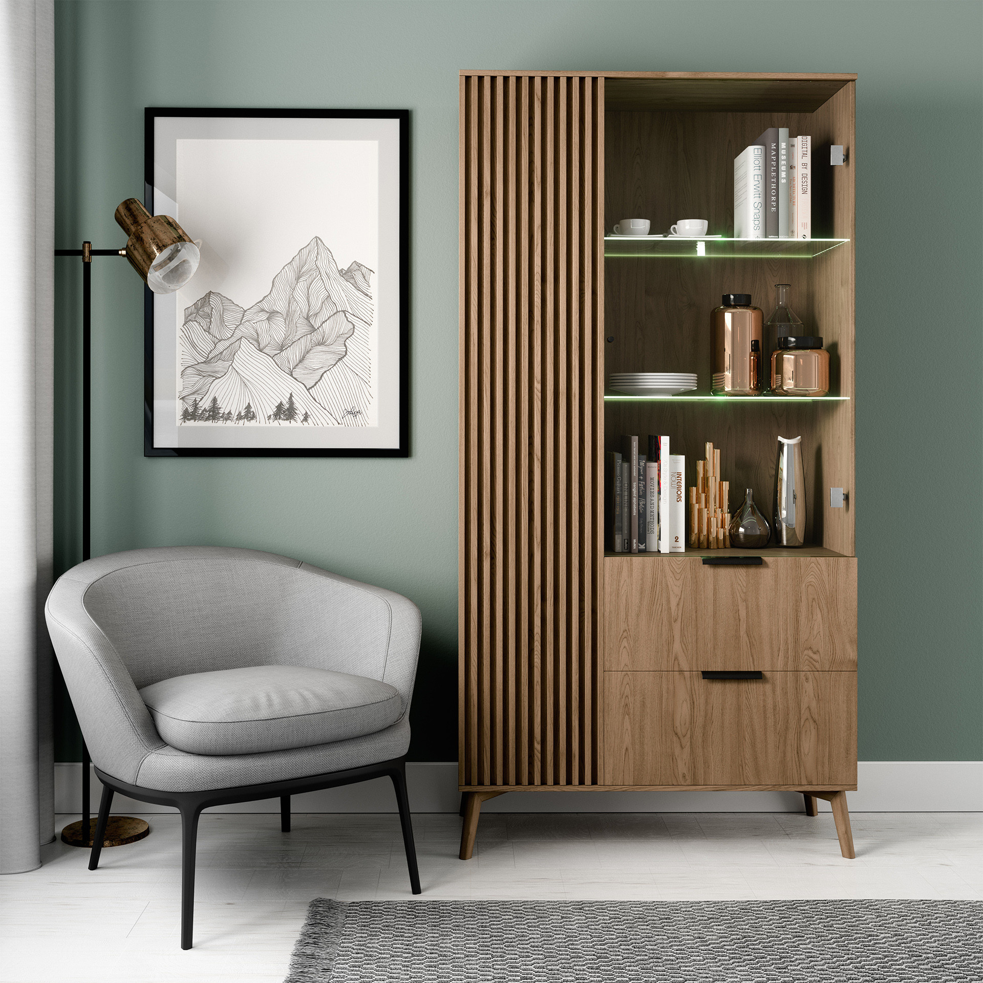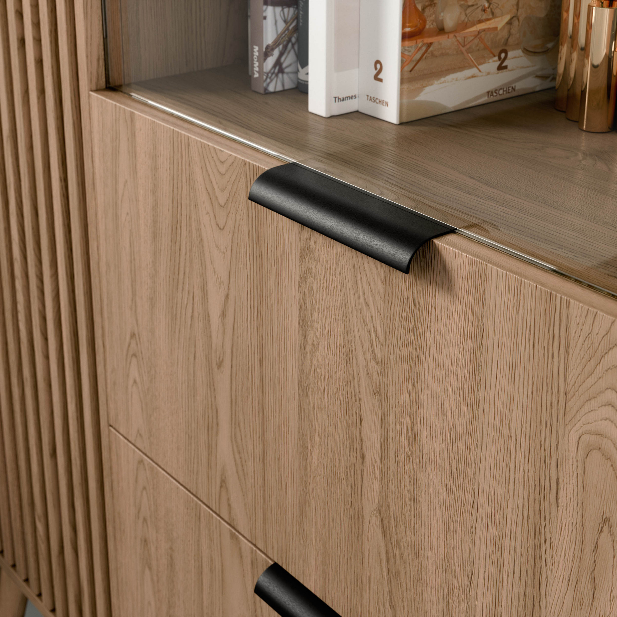 Tato vitrína je ideální volbou pro obývací pokoje, jídelny nebo kanceláře. Její univerzální design a neutrální barevné provedení umožňují snadné začlenění do různých stylů interiérů, od moderních po klasické. Vitrína ENTSIAN 100 nejenže poskytuje praktické úložné řešení, ale také přidává do vašeho domova nádech elegance a sofistikovanosti.