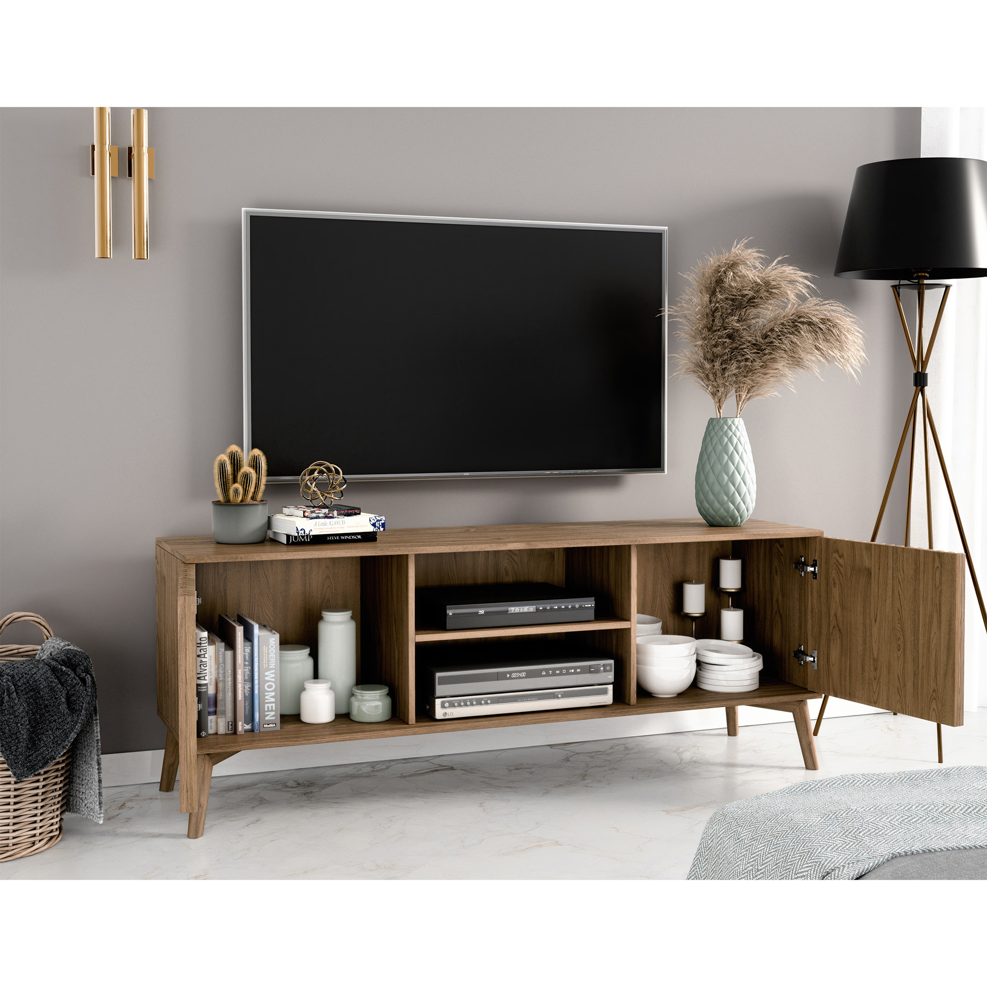 Komoda ENTSIAN je navržena s ohledem na praktičnost a estetiku. Její prostorná horní plocha je ideální pro umístění televize, zatímco spodní část nabízí dostatek úložného prostoru pro vaše DVD přehrávače, herní konzole a další příslušenství. Díky promyšlenému designu budete mít vše potřebné na dosah ruky, aniž byste museli obětovat styl.