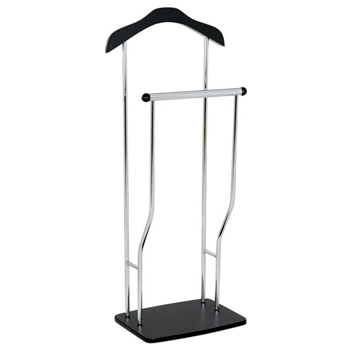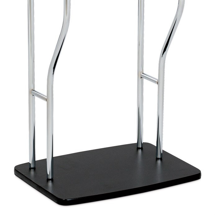 Němý sluha v černém matném provedení kombinuje pevnou MDF základnu s chromovanými kovovými prvky, které zajišťují stabilitu a dlouhou životnost. Výška 108 cm umožňuje pohodlné zavěšení oděvů na ramínko, zatímco spodní tyč slouží k zavěšení kalhot nebo šál. Design s čistými liniemi a kontrastem černé a chromu se hodí do moderních i klasických interiérů. Nosnost až 5 kg odpovídá běžnému domácímu použití. Praktický doplněk do ložnice či předsíně usnadňuje organizaci oblečení.