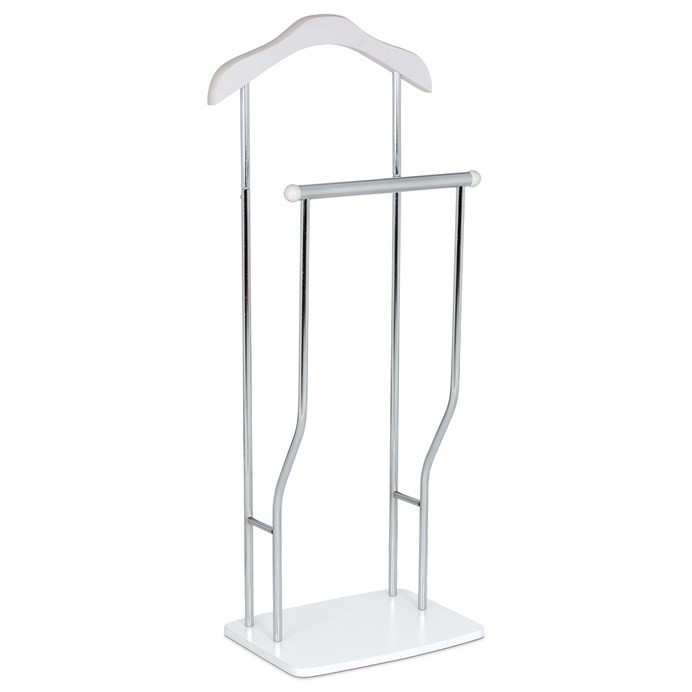 Němý sluha v bílém matném laku z MDF a s chromovanými kovovými prvky nabízí praktické řešení pro uložení oblečení a doplňků. Jeho pevná základna zajišťuje stabilitu, zatímco horní část ve tvaru ramínka umožňuje zavěšení košil, sak či kalhot. Kompaktní výška 108 cm usnadňuje umístění v ložnici nebo předsíni, přičemž nosnost do 5 kg odpovídá běžné domácí potřebě. Design kombinuje jednoduchost a funkčnost, což ocení každý, kdo hledá nenáročný způsob organizace oblečení.