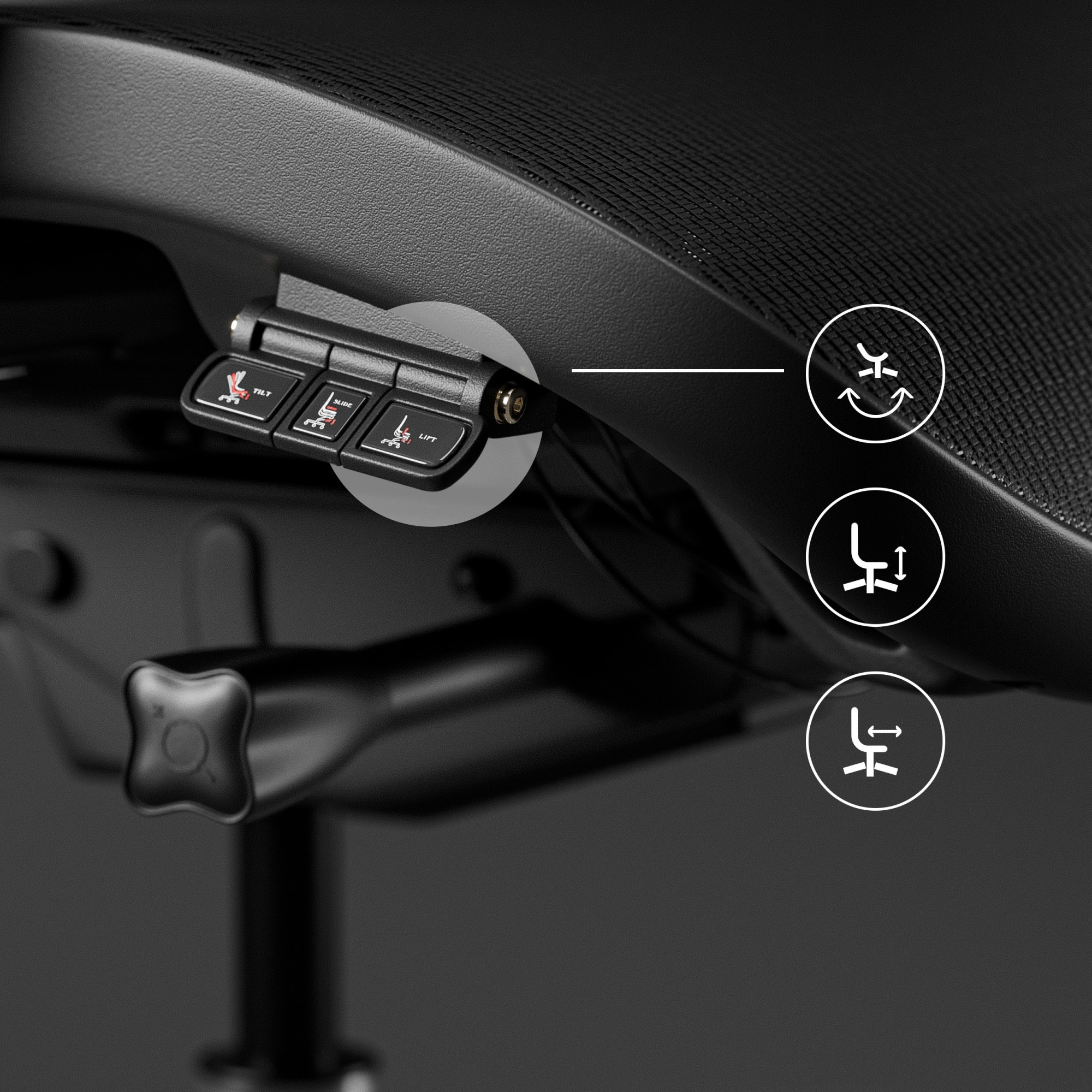 Systém Tilttech™ Gear představuje řadu nastavení, která vám umožní přizpůsobit židli přesně vašim individuálním potřebám. Sedák je vybaven funkcí regulace vpřed-vzad a nahoru-dolů, což zajišťuje optimální polohu pro vaše nohy a minimalizuje tlak na stehna.