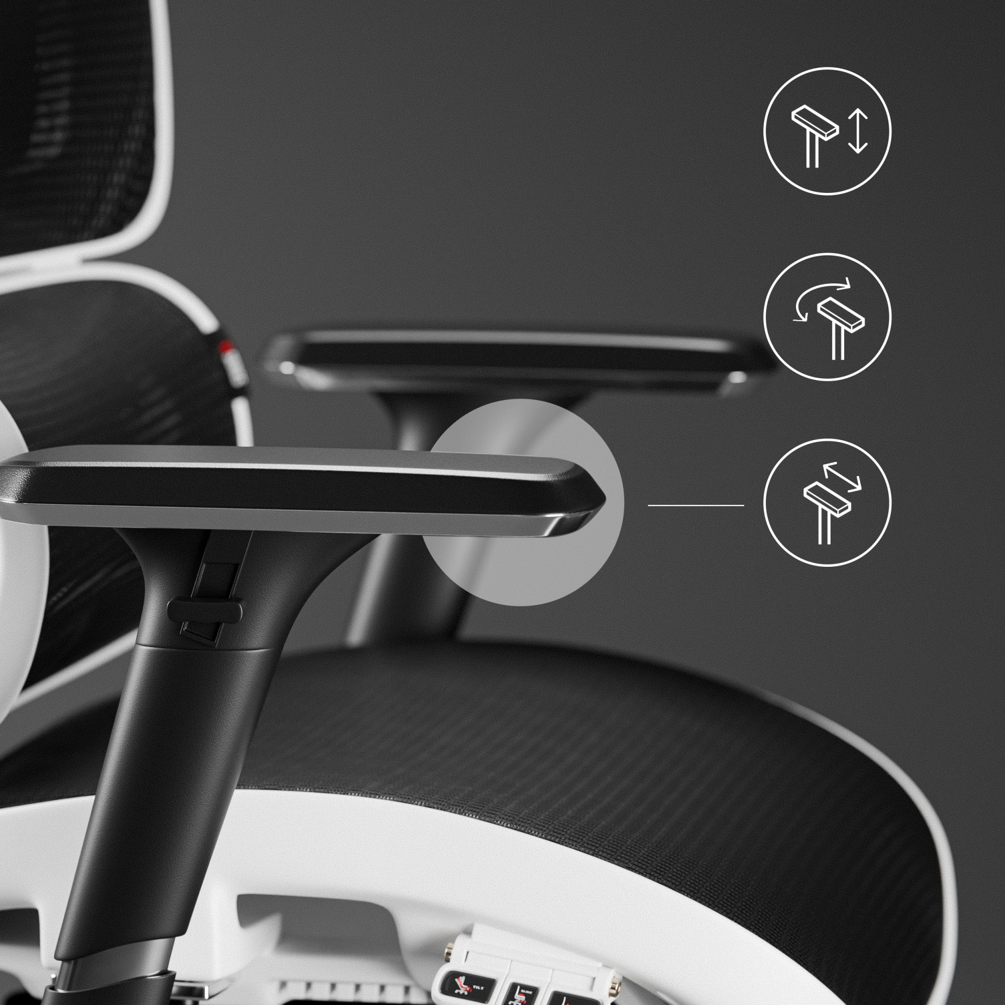 Systém Tilttech™ Gear představuje komplexní sadu nastavení, která umožňují precizní přizpůsobení židle Vaší postavě. Sedák je vybaven funkcí regulace vpřed-vzad a nahoru-dolů, což zajišťuje optimální polohu sezení. Područky Armtech™ Hybrid SoftTouch poskytují vynikající oporu pro Vaše ruce, díky měkké pěně, kterou jsou potaženy. Jejich polohu lze nastavit až ve 3 rovinách, což uleví Vašim rukám a stabilizuje Vaši postavu.