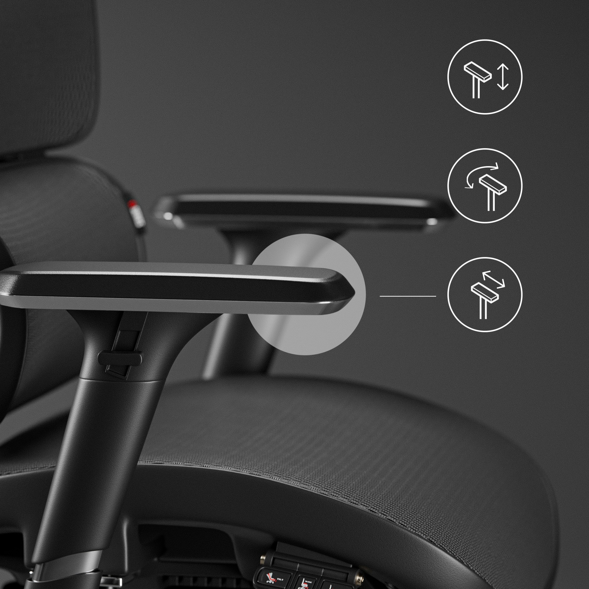 - Područky s nastavením ve 3 směrech (Armtech™ Hybrid SoftTouch): Područky s měkkým povrchem a nastavením ve třech směrech poskytují optimální oporu pro vaše ruce a předloktí, čímž snižují napětí v ramenou a krku.
