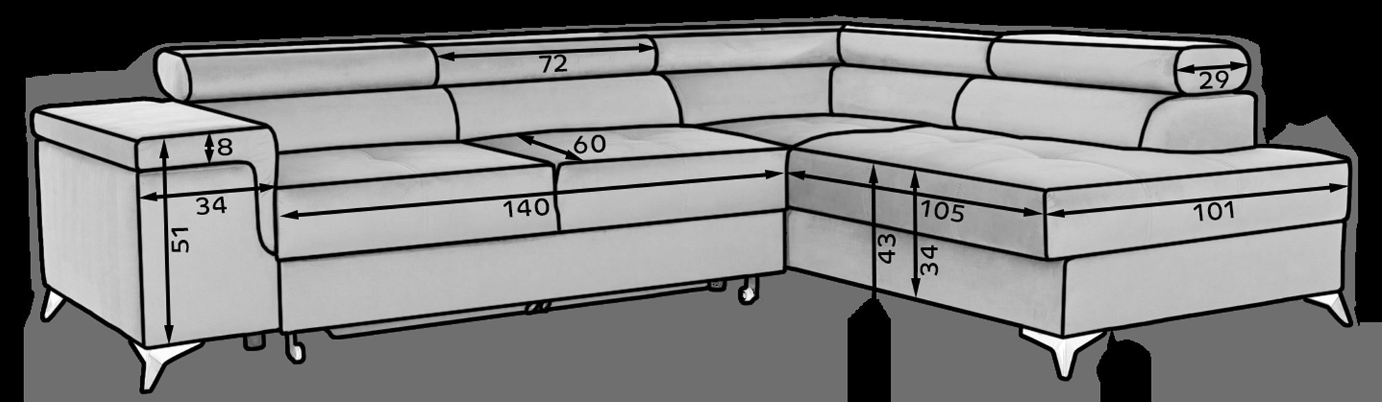 Jednou z hlavních předností této sedací soupravy je její praktický úložný prostor, který vám umožní snadno uschovat deky, polštáře nebo jiné předměty, které chcete mít po ruce, ale zároveň je mít úhledně uklizené. Díky funkci rozkládání se sedací souprava ERIDANO snadno promění v pohodlné lůžko s plochou na spaní 125x193 cm, což je ideální pro hosty nebo pro příležitostné přespání.
