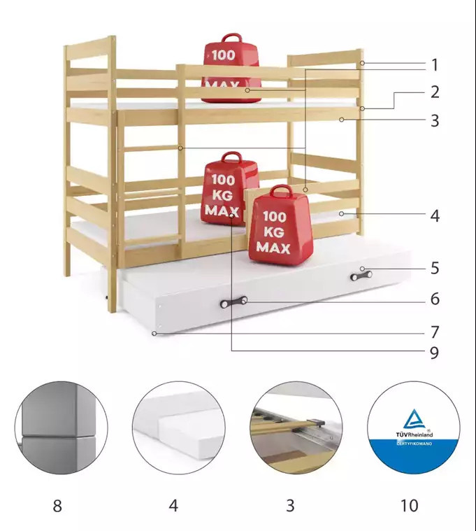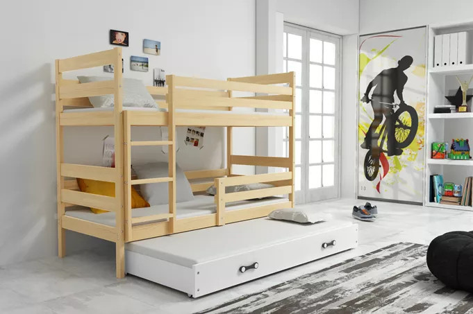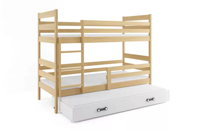 Dětská patrová postel ERYK 3 s přistýlkou 90x200 cm, včetně matrací, Přírodní/Bílá