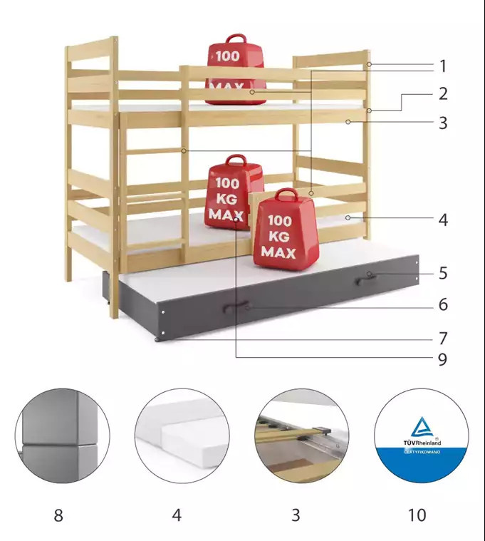 Dětská patrová postel ERYK 3 s přistýlkou 90x200 cm, včetně matrací, Přírodní/Grafit