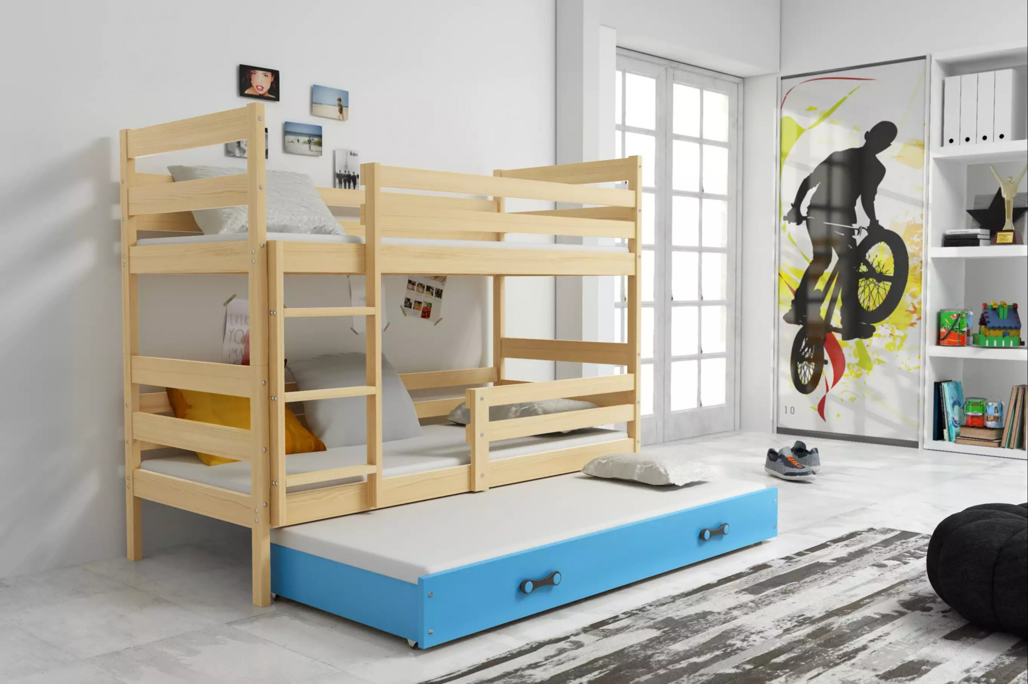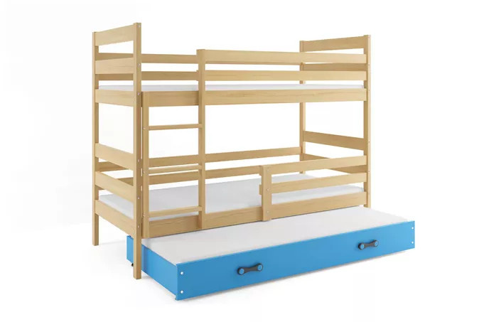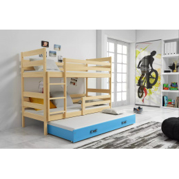 Dětská patrová postel ERYK 3 s přistýlkou 90x200 cm, bez matrace, Přírodní/Modrá
