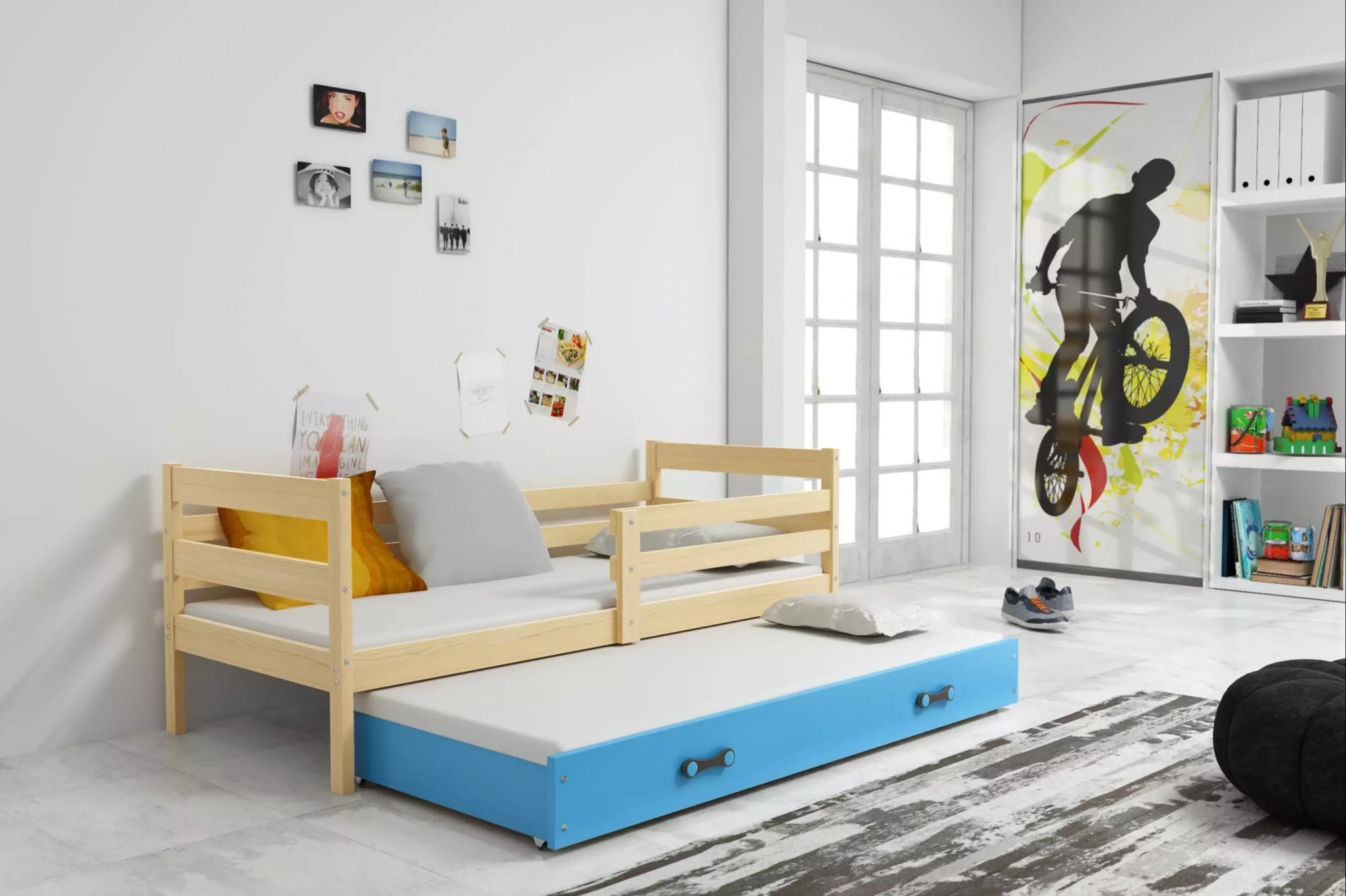 Dětská postel ERYK s přistýlkou 90x200 cm, bez matrace, Přírodní/Modrá