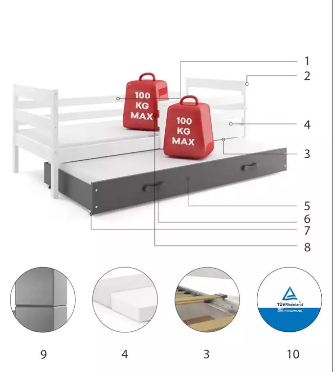 Dětská postel ERYK s přistýlkou 80x190 cm, včetně matrací, Bílá/Grafit