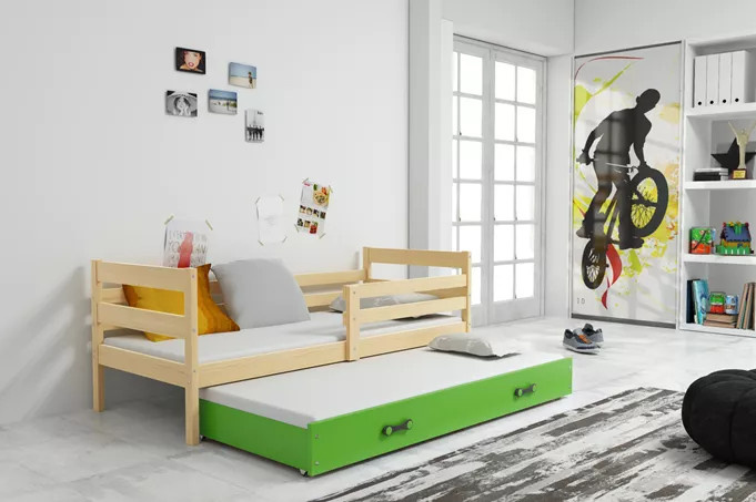 Dětská postel ERYK s přistýlkou 80x190 cm, včetně matrací, Přírodní/Zelená