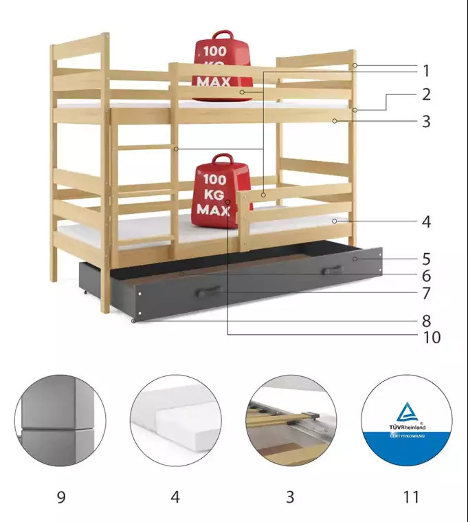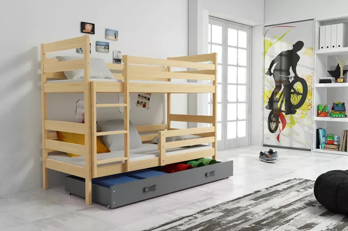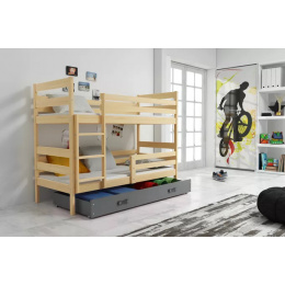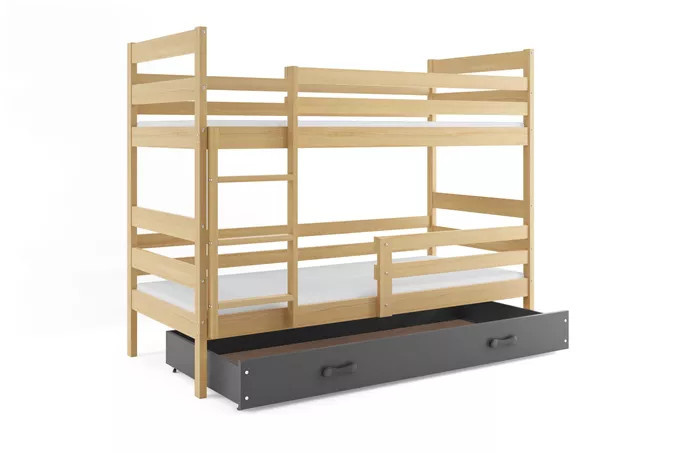 Dětská patrová postel ERYK se šuplíkem 90x200 cm, včetně matrací, Přírodní/Grafit