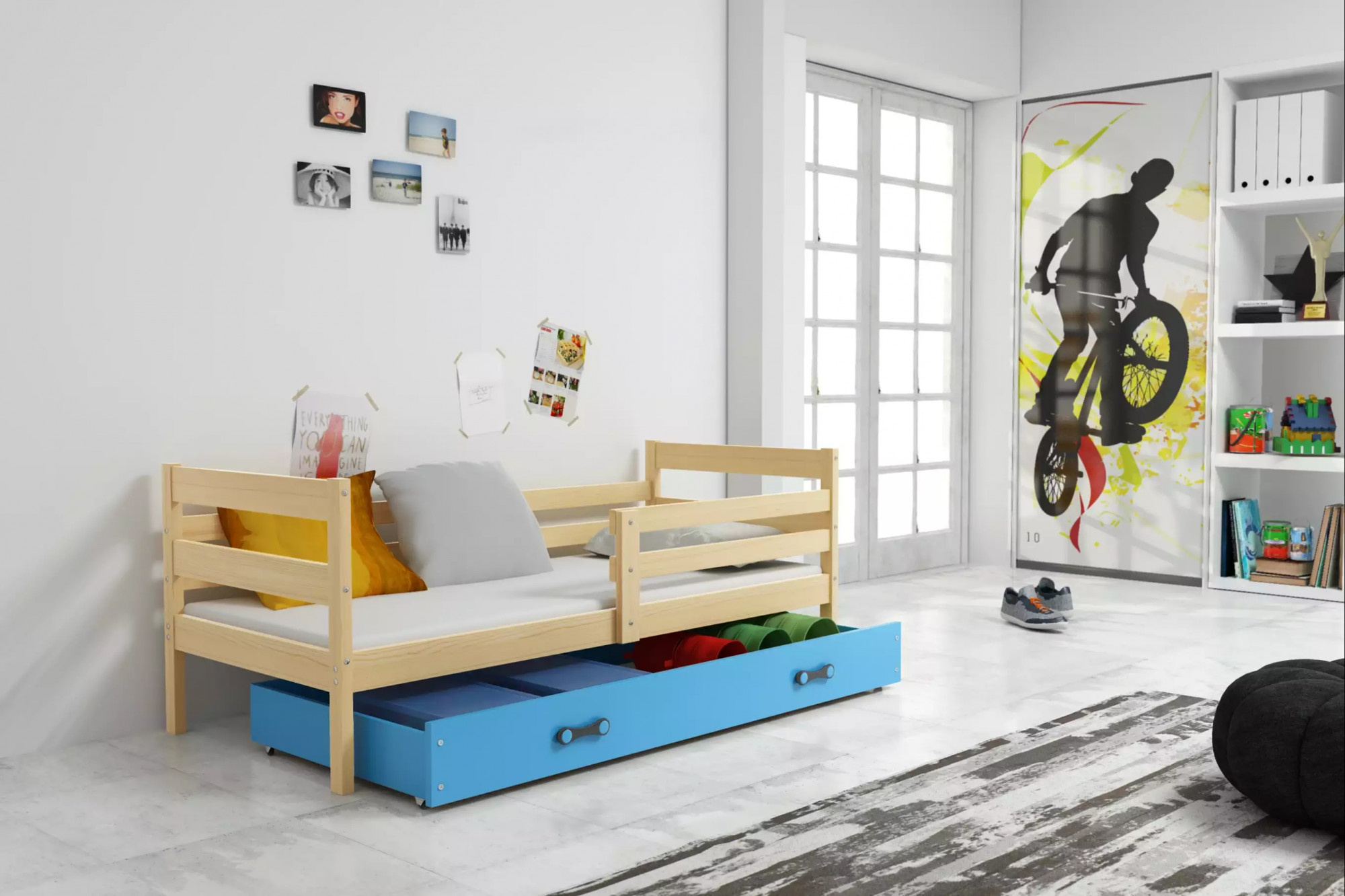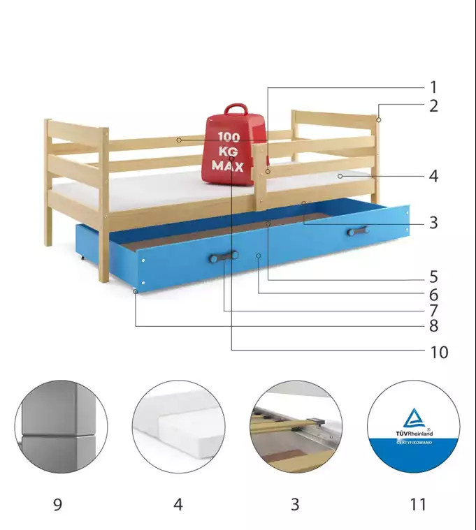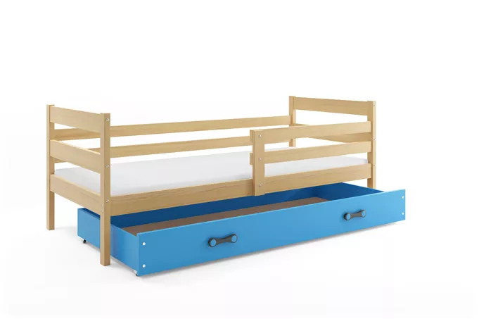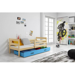 Dětská postel ERYK 90x200 cm se šuplíkem, bez matrace, Přírodní/Modrá