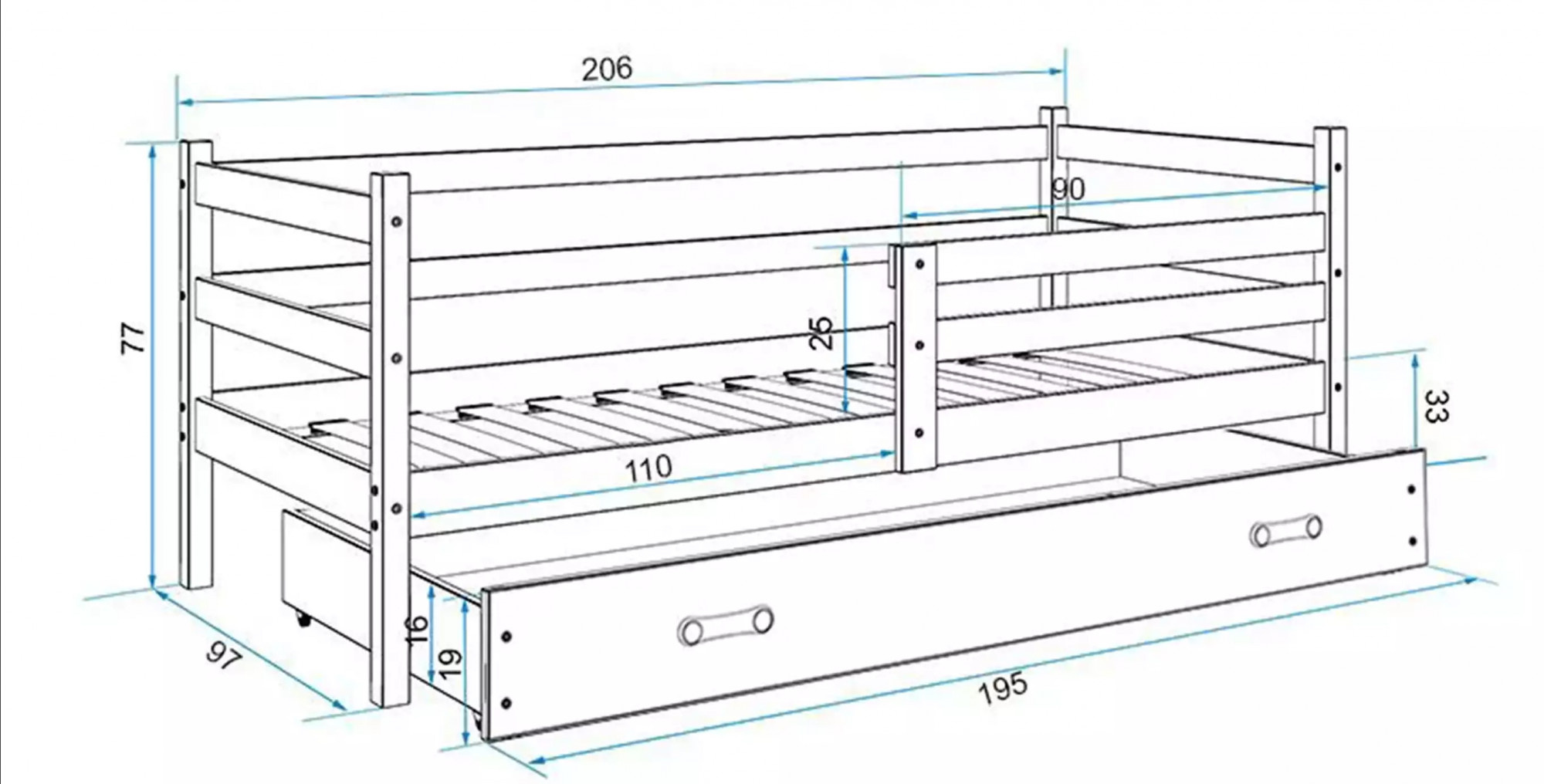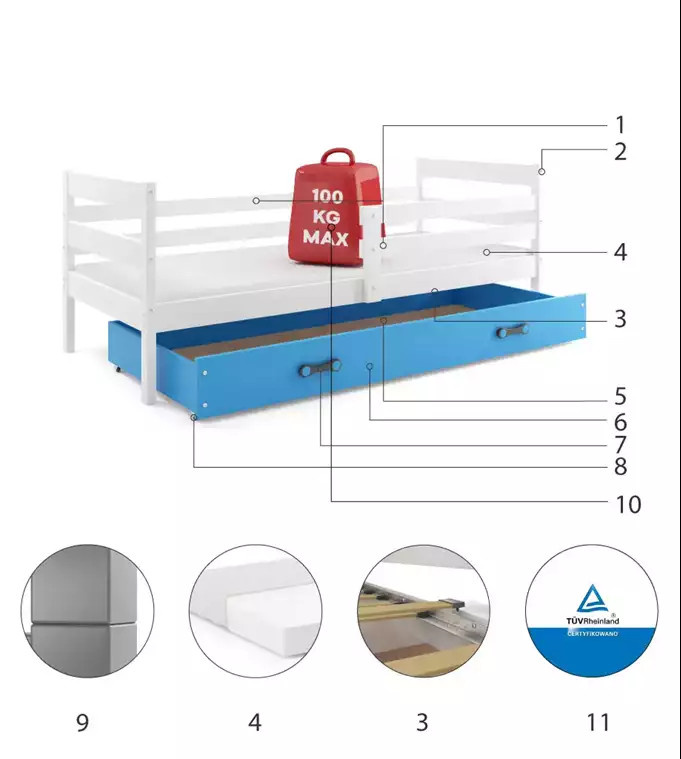 Dětská postel ERYK 90x200 cm se šuplíkem, s matrací, Bílá/Modrá