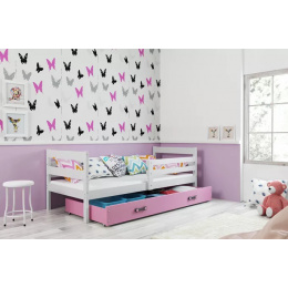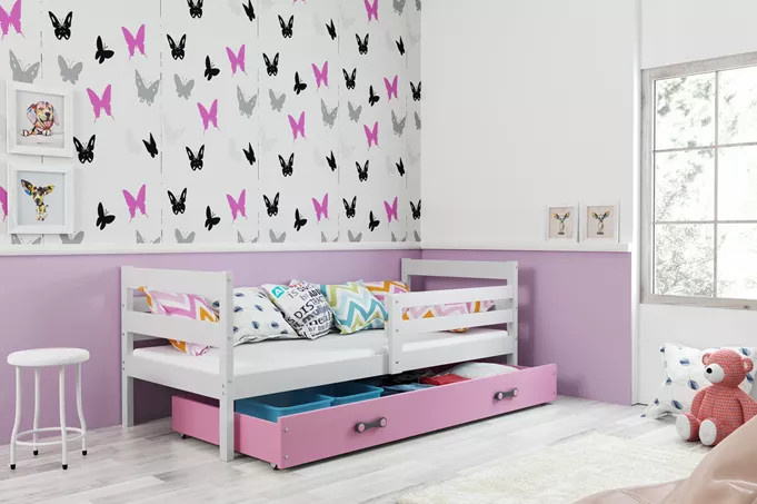 Dětská postel ERYK 90x200 cm se šuplíkem, s matrací, Bílá/Růžová
