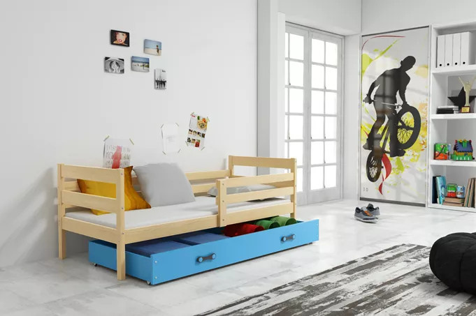 Dětská postel ERYK 90x200 cm se šuplíkem, s matrací, Přírodní/Modrá